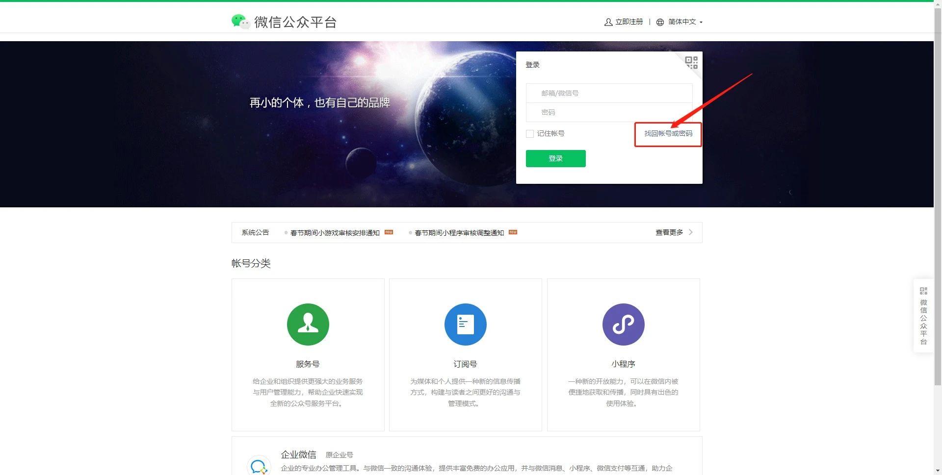 第一步,进入微信公众号主页https://mp.weixin.qq.com/
