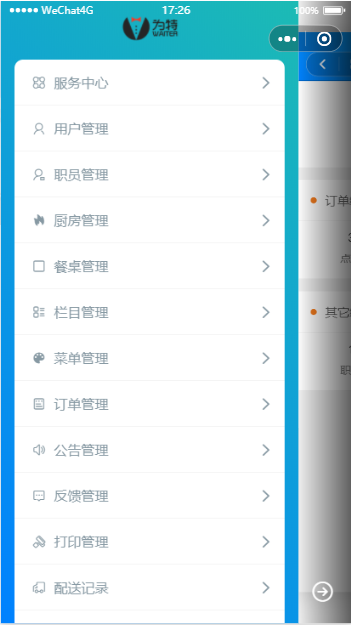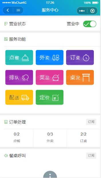 服务中心,提供服务员常用的功能,如服务员帮助客人下单,菜品状态更新,查看餐桌状况,自定义菜品价格(当菜品价格为时价,通过扫码获取价格),订单处理(接单、制作、取消、退款、完成等功能),排队取号和餐桌呼叫的处理,配送跟踪辅助功能(扫码取件,完成订单,退回订单,订阅派单通知等)
