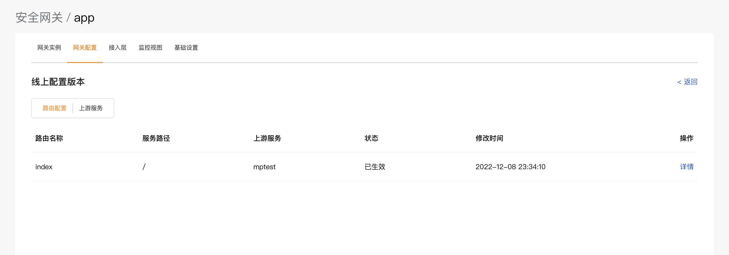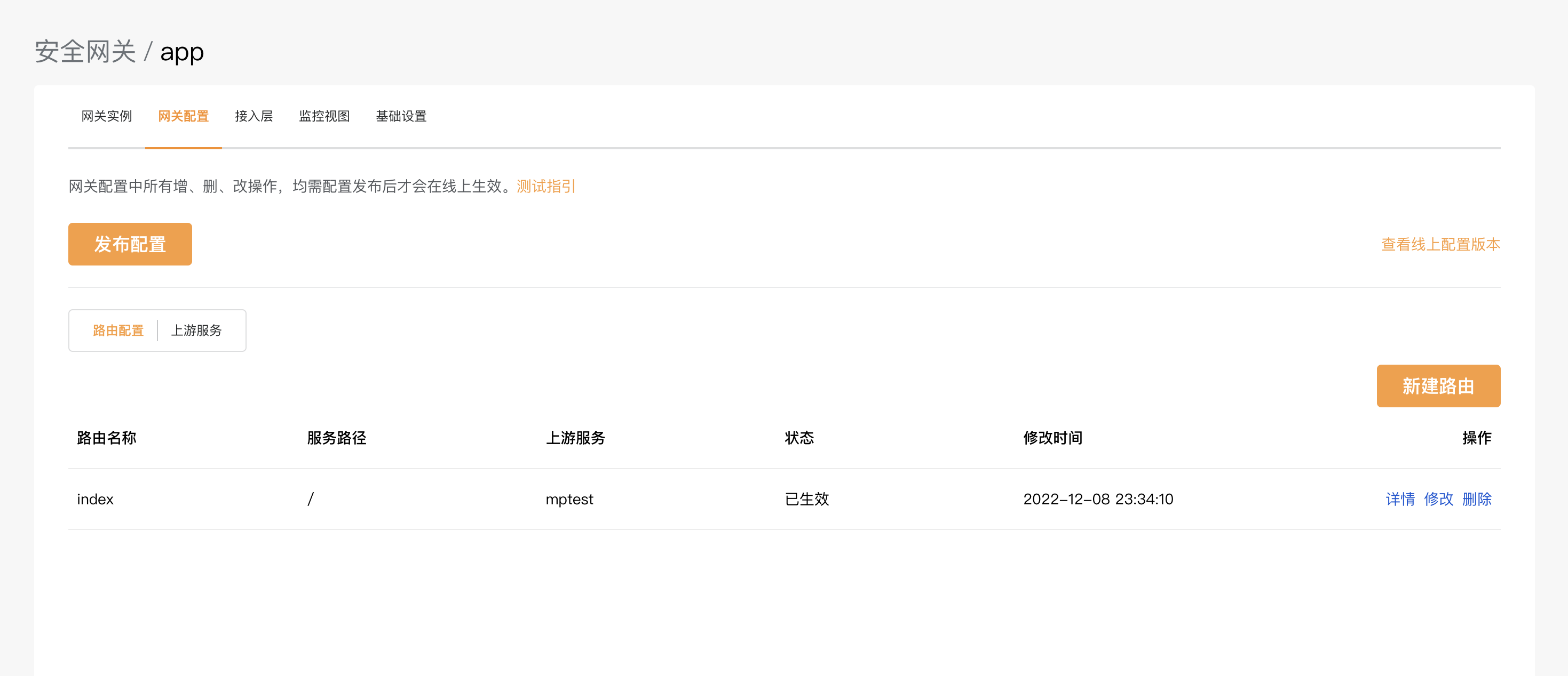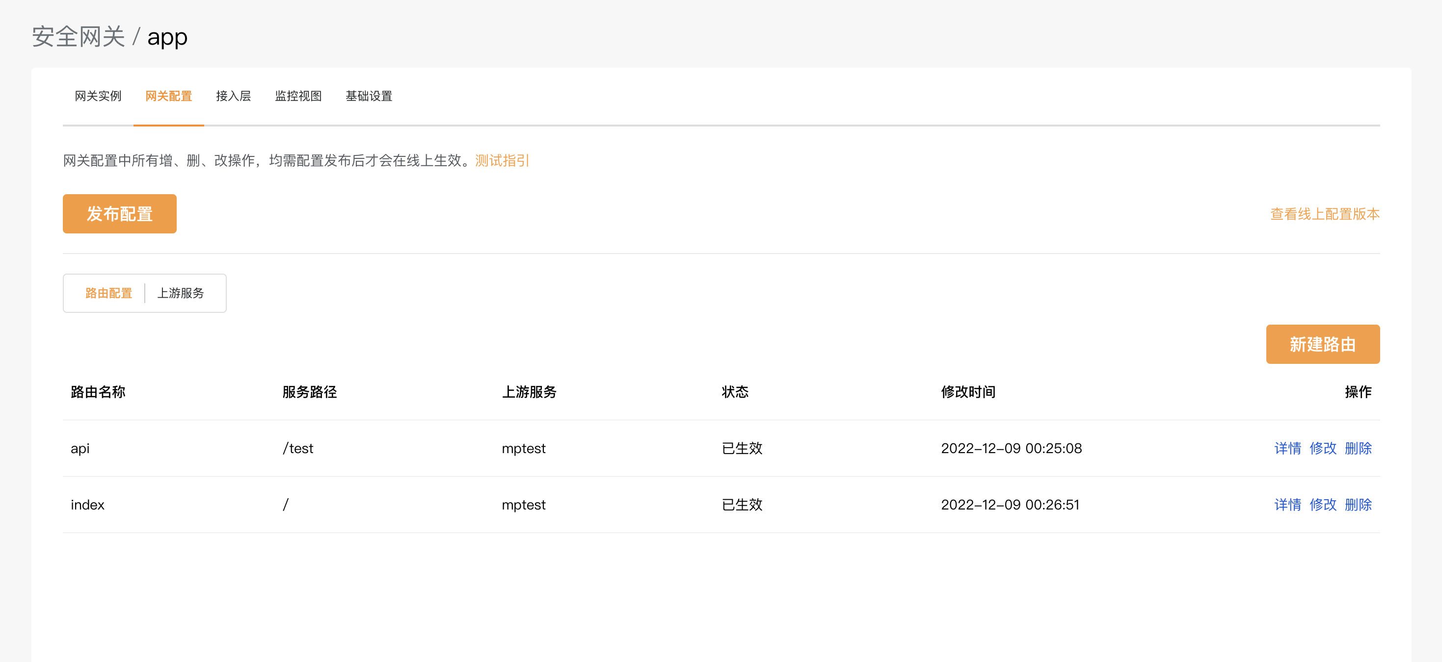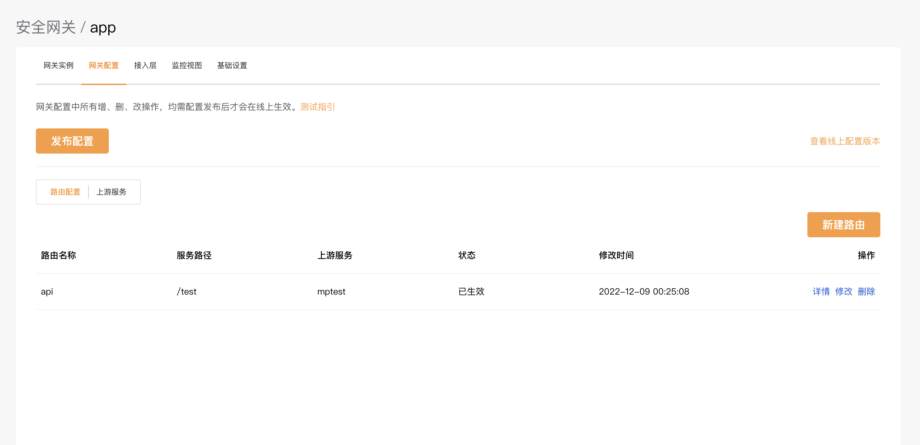 线上有了配置之后,我们就可以在右侧点击「线上网关配置」查看线上生效的配置情况
