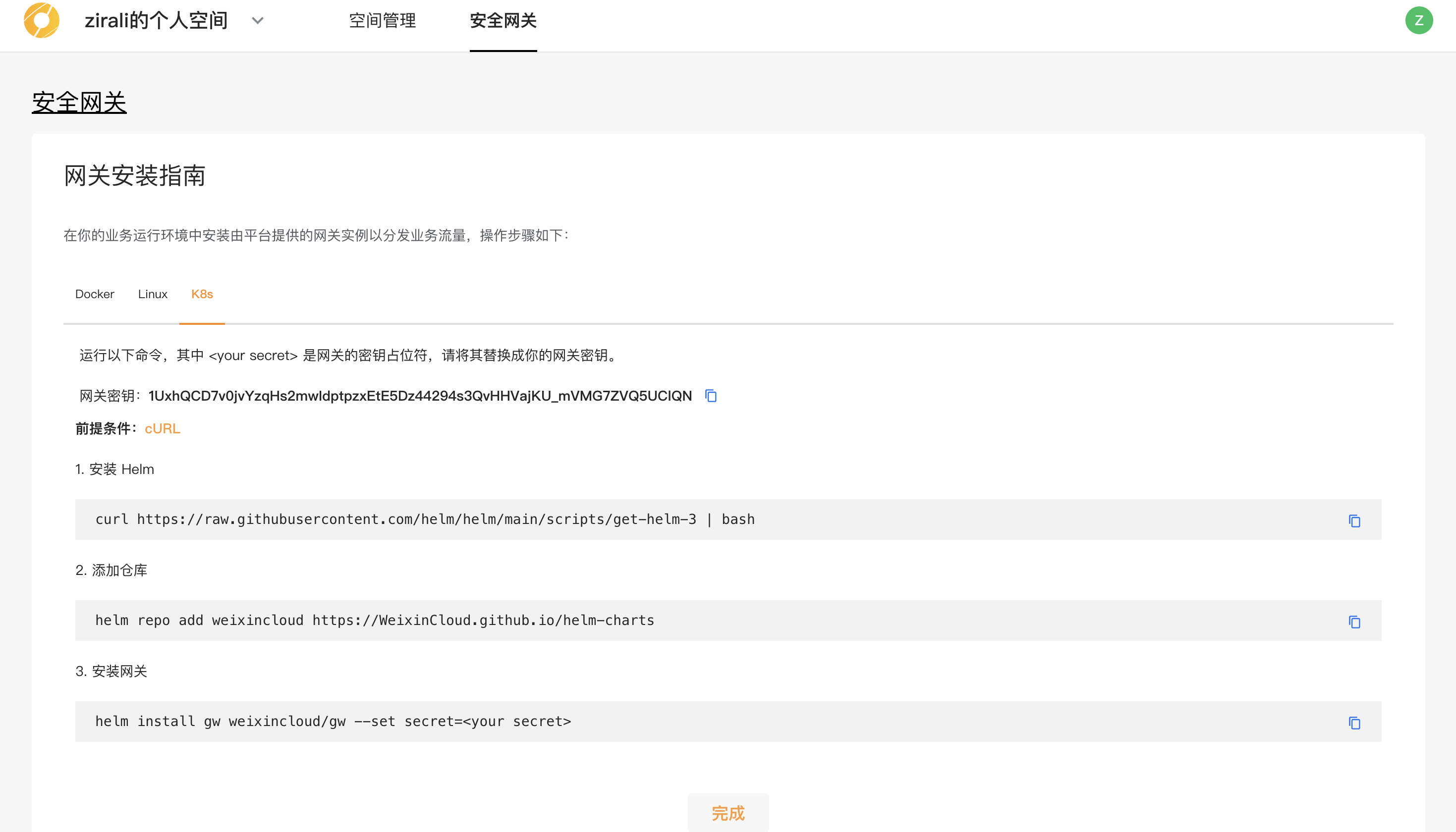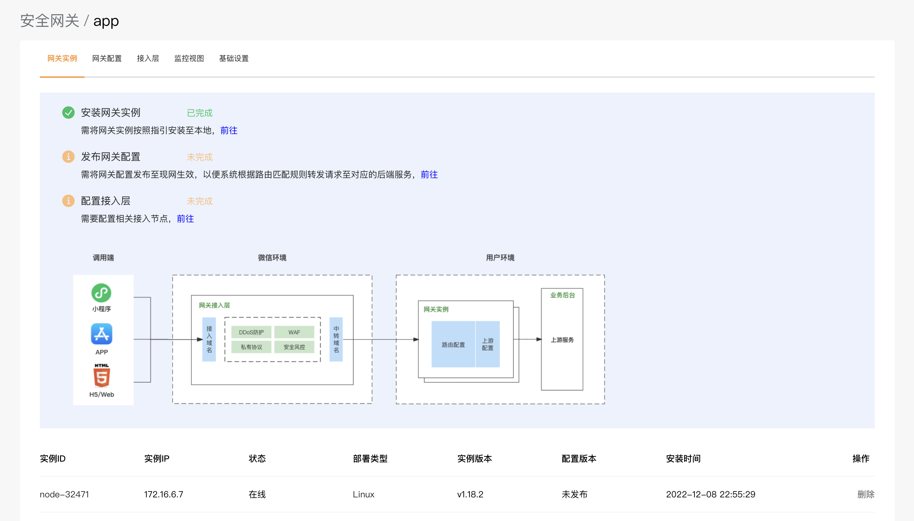 网关实例安装完毕后,控制台中点击「完成」按钮,进入下一步,可以在实例列表中看到已经安装在线的实例。