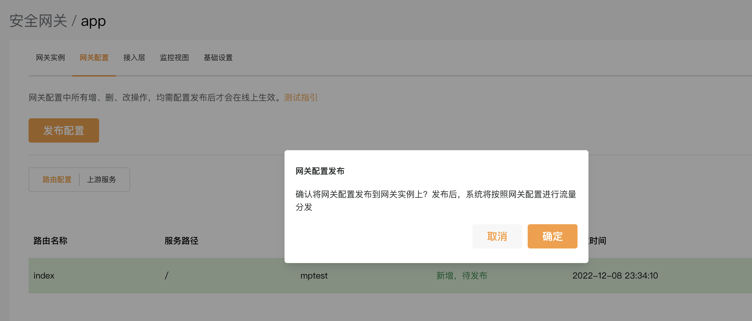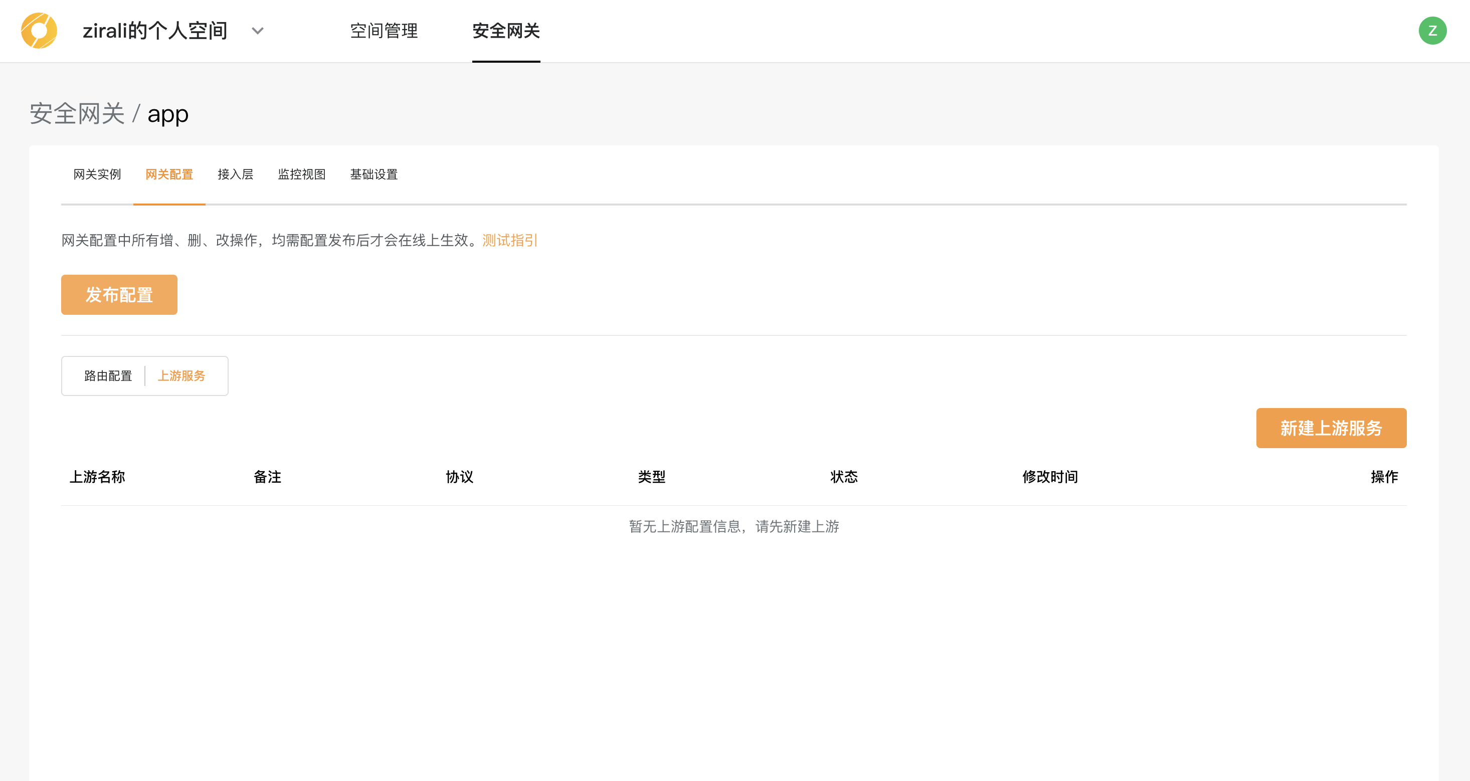 在控制台中反复配置的路由和上游服务,并不会影响实际线上的网关实例。我们在配置完成后,需要点击控制台的「发布配置」按钮,将配置上传至网关实例。此时网关实例才能够应用我们的最新配置。 ·