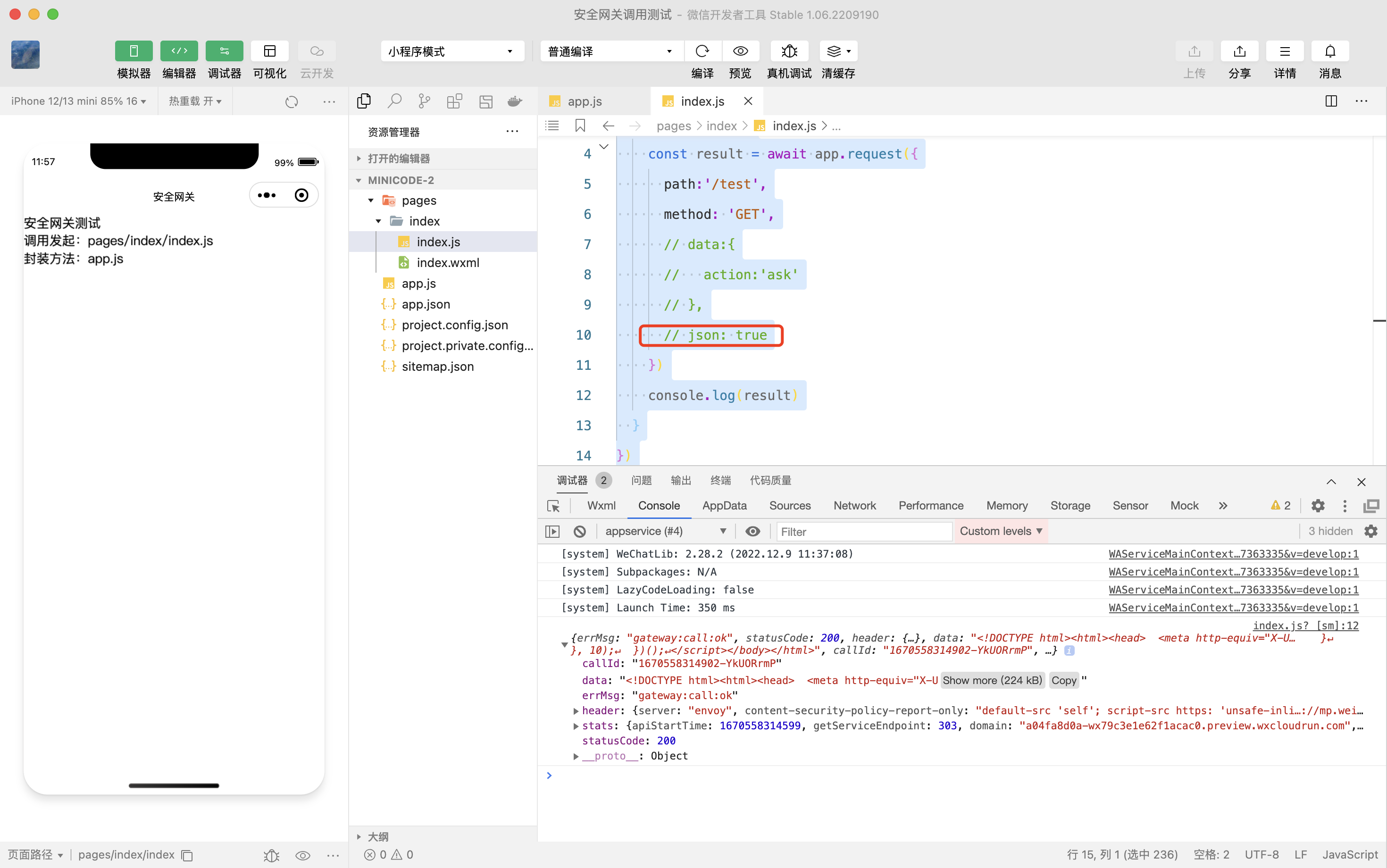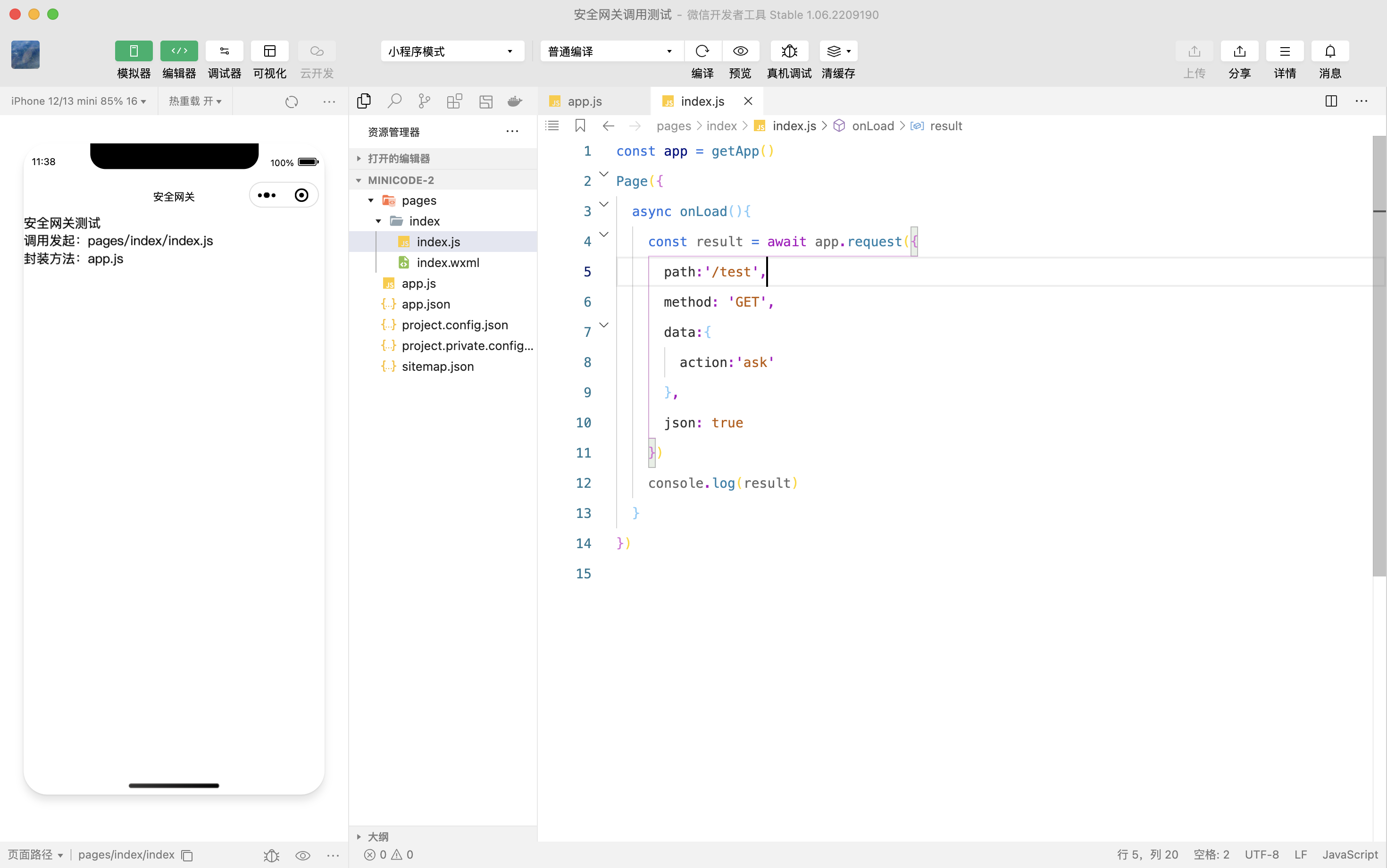 请求的触发在 pages/index/index.js 中,代码片段中初始的是前面步骤简单访问时的页面