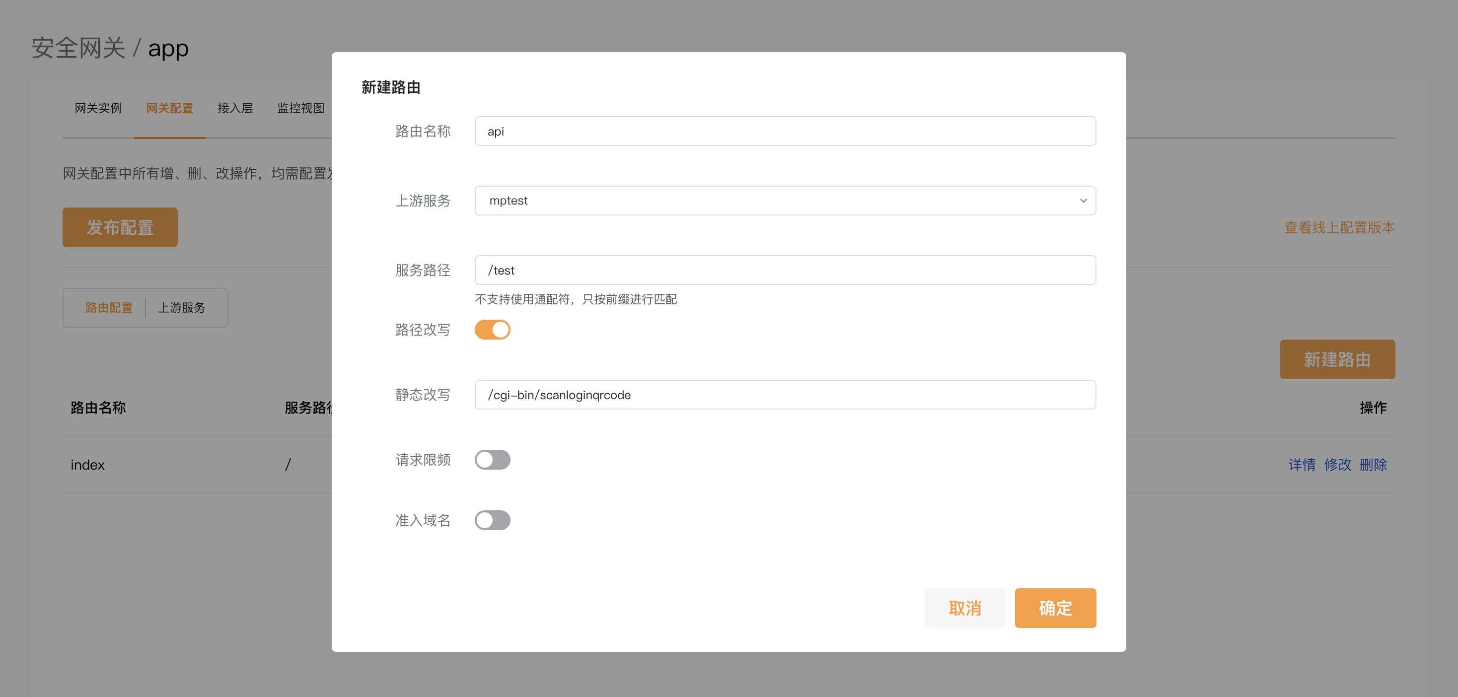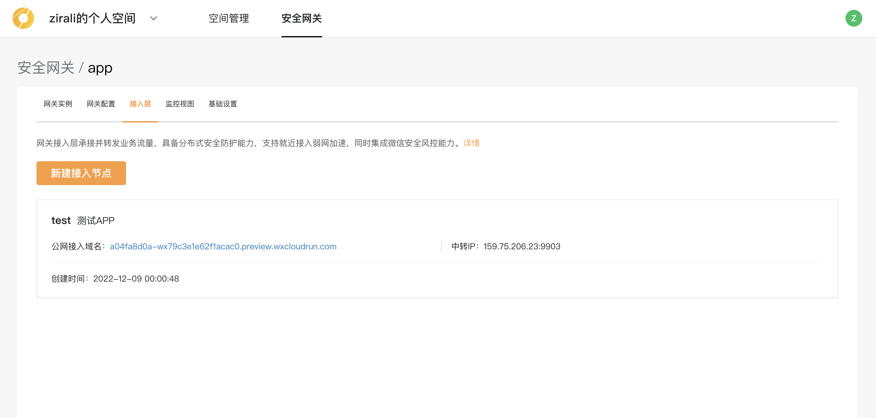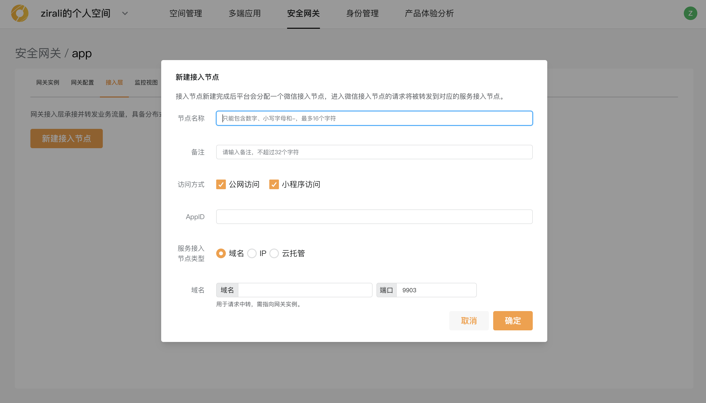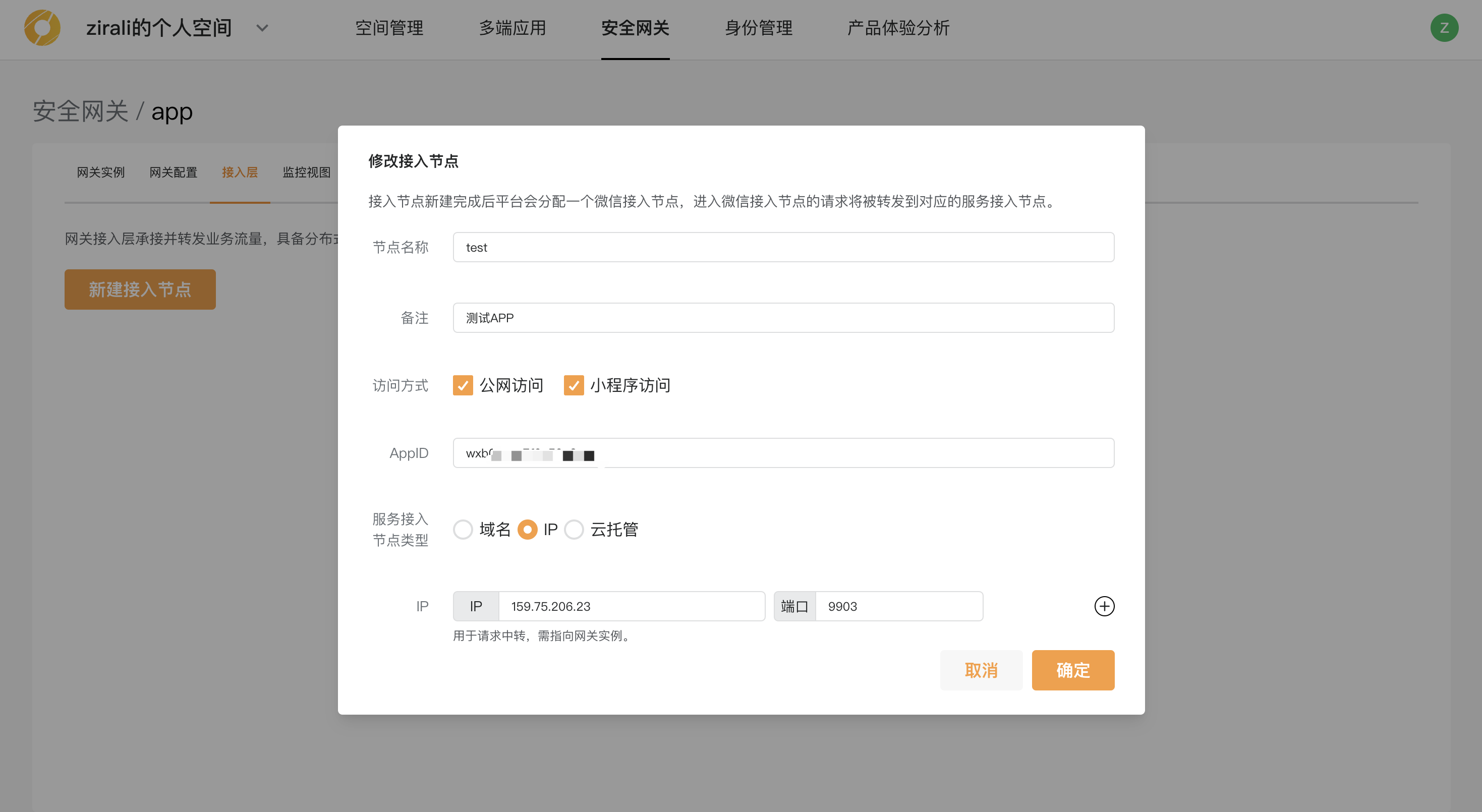 - 访问方式:公网访问、小程序访问,可以根据自己的接入需要来选择,这会控制你的客户端请求的访问许可。
