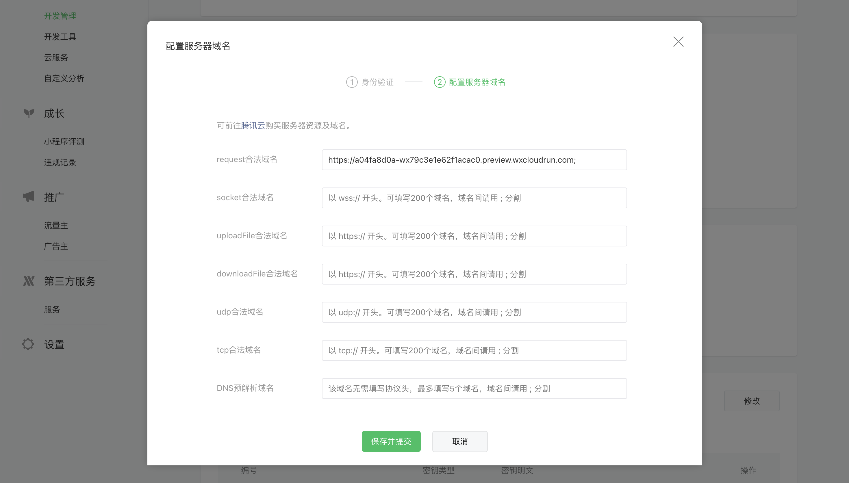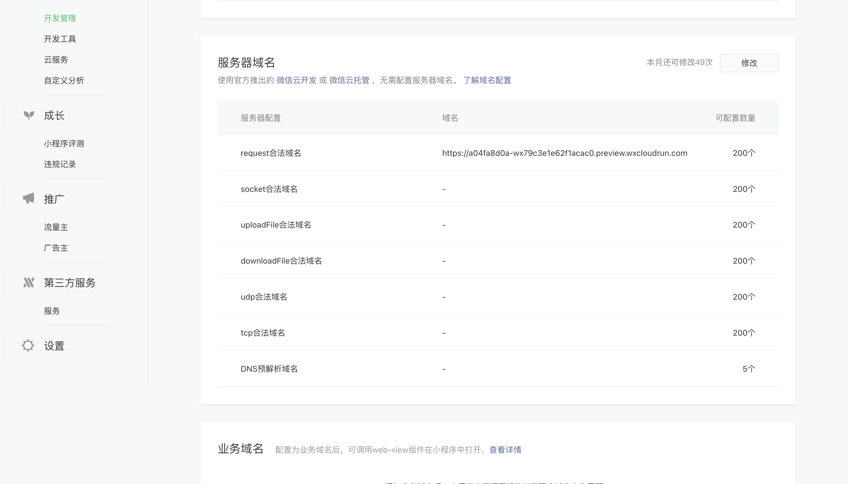 当前,网关的请求需要在mp后台配置request域名,直接将节点域名的完整地址填入就可以,协议为https,如下: