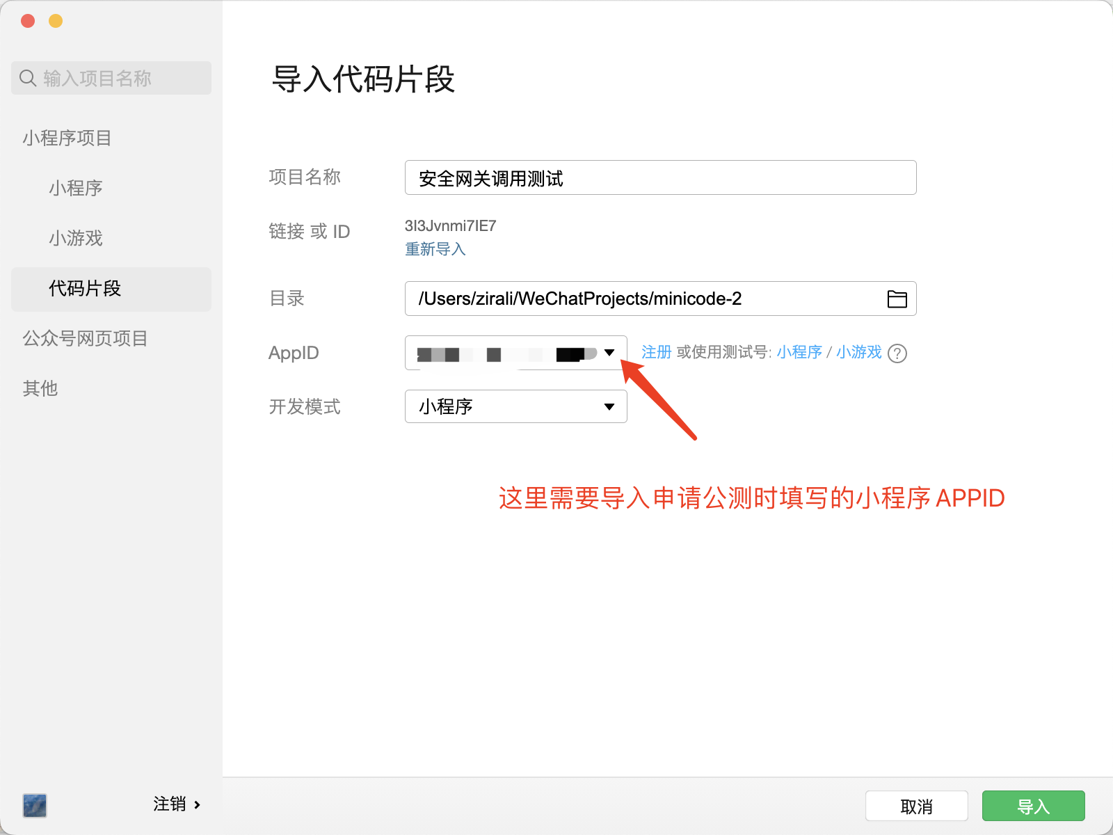 导入时需要注意使用第一步申请公测时填写的APPID,不要填写其他或者接口测试号,将不会显示 develop 基础库。