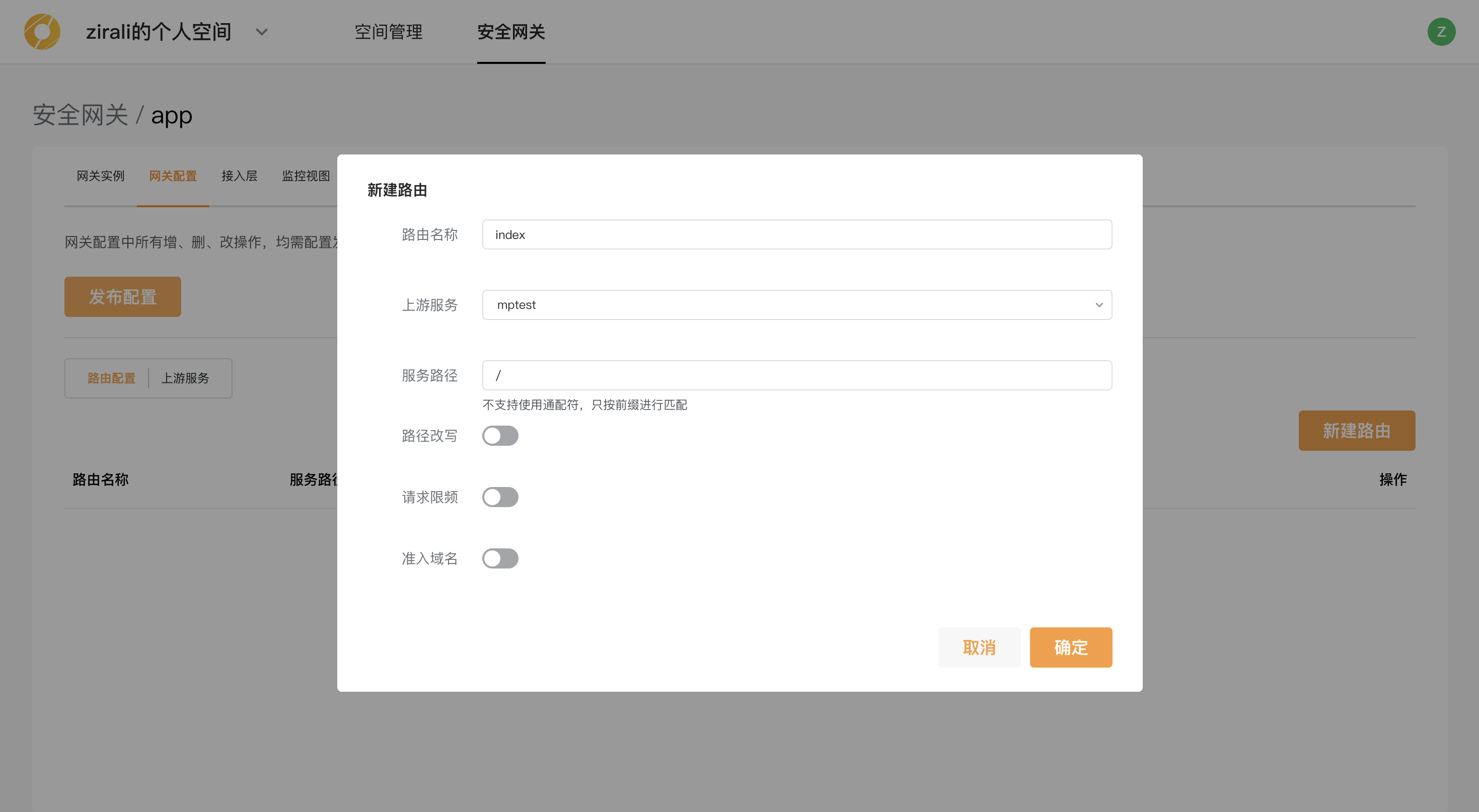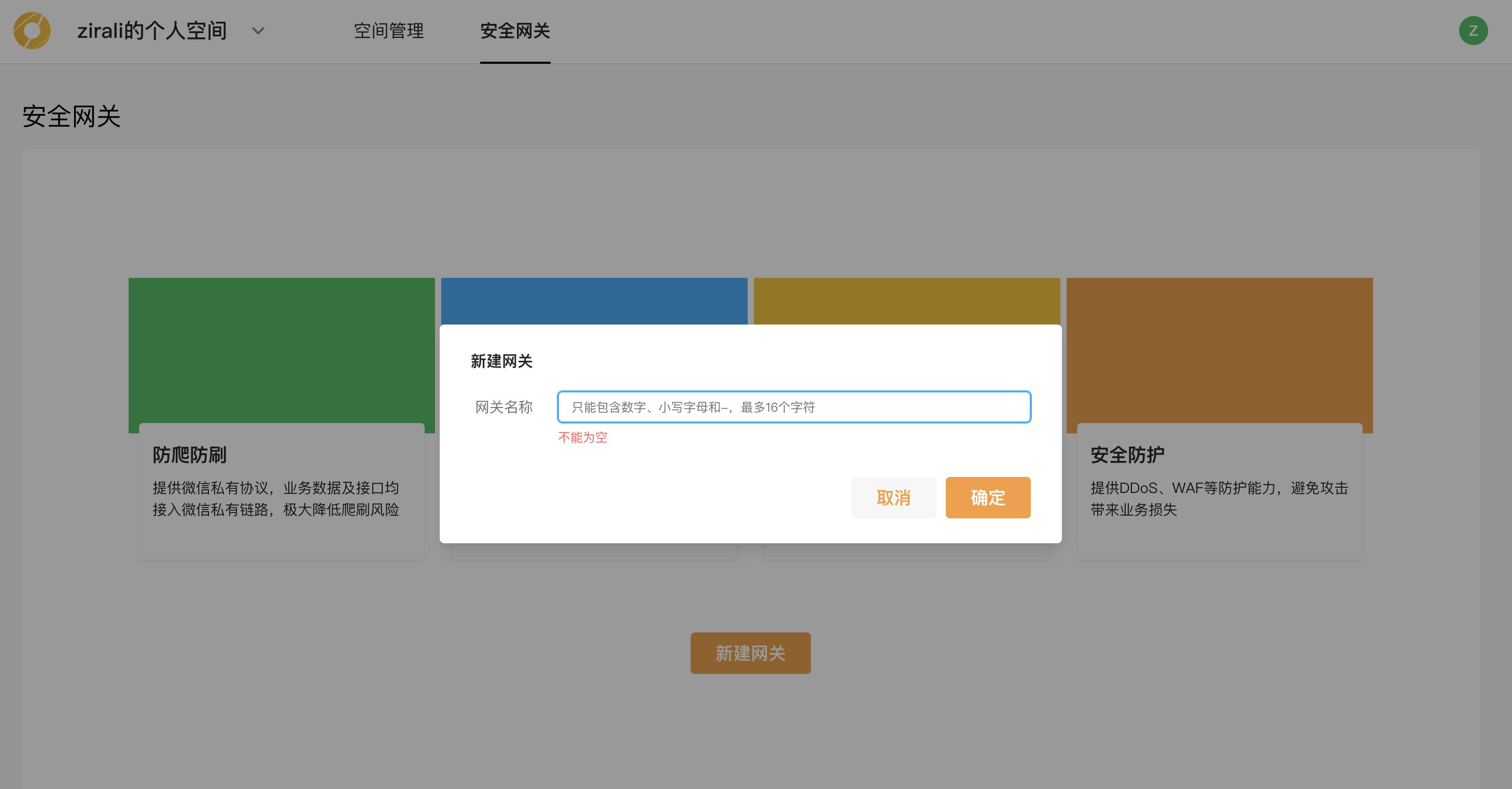 在安全网关页面点击「新建网关」按钮,在弹出的对话框中填写网关名称,完成新建。一般网关以使用角度的应用维度区分,一般只需要一个即可,可以再创建一个用于规则测试。