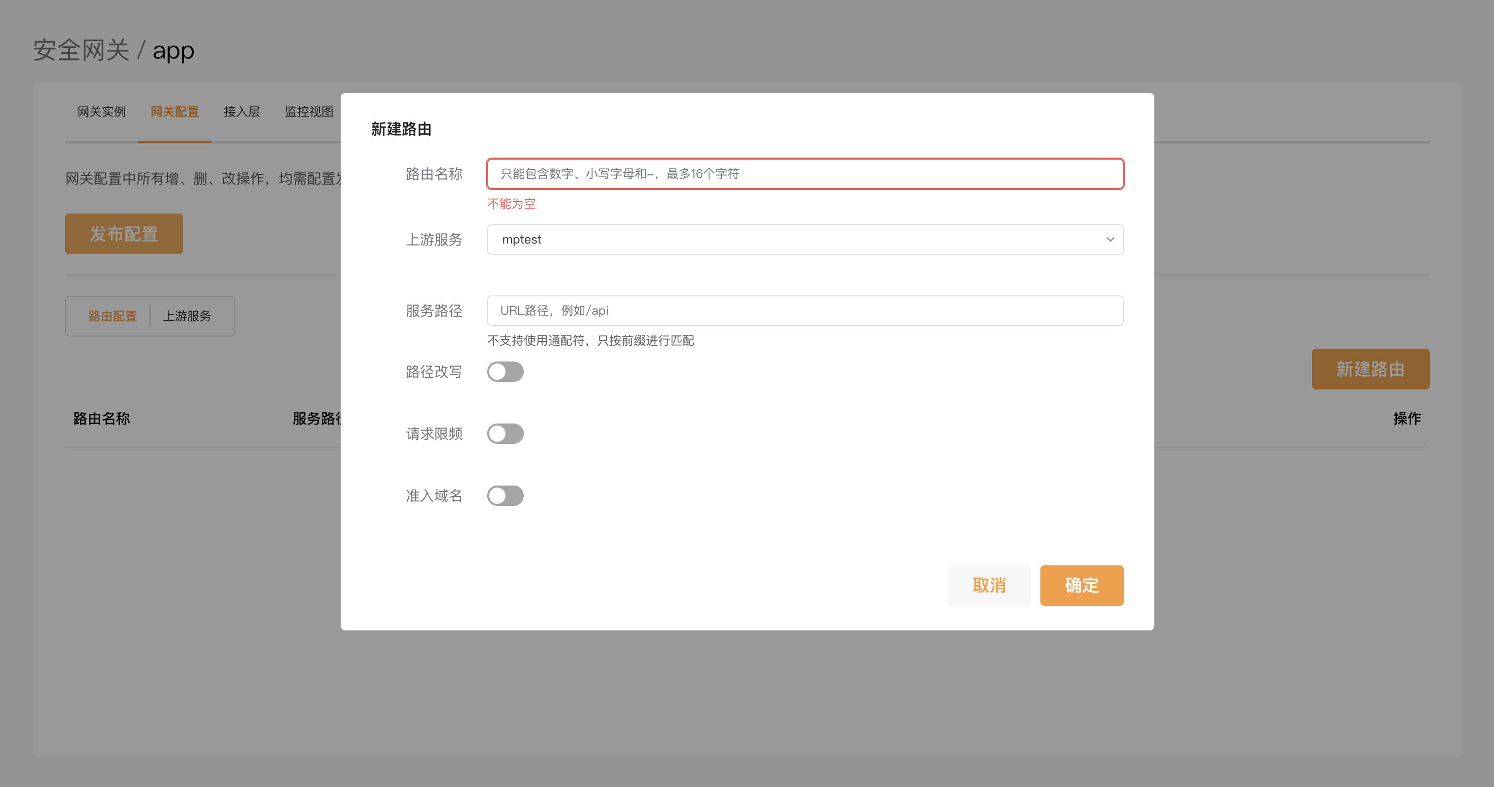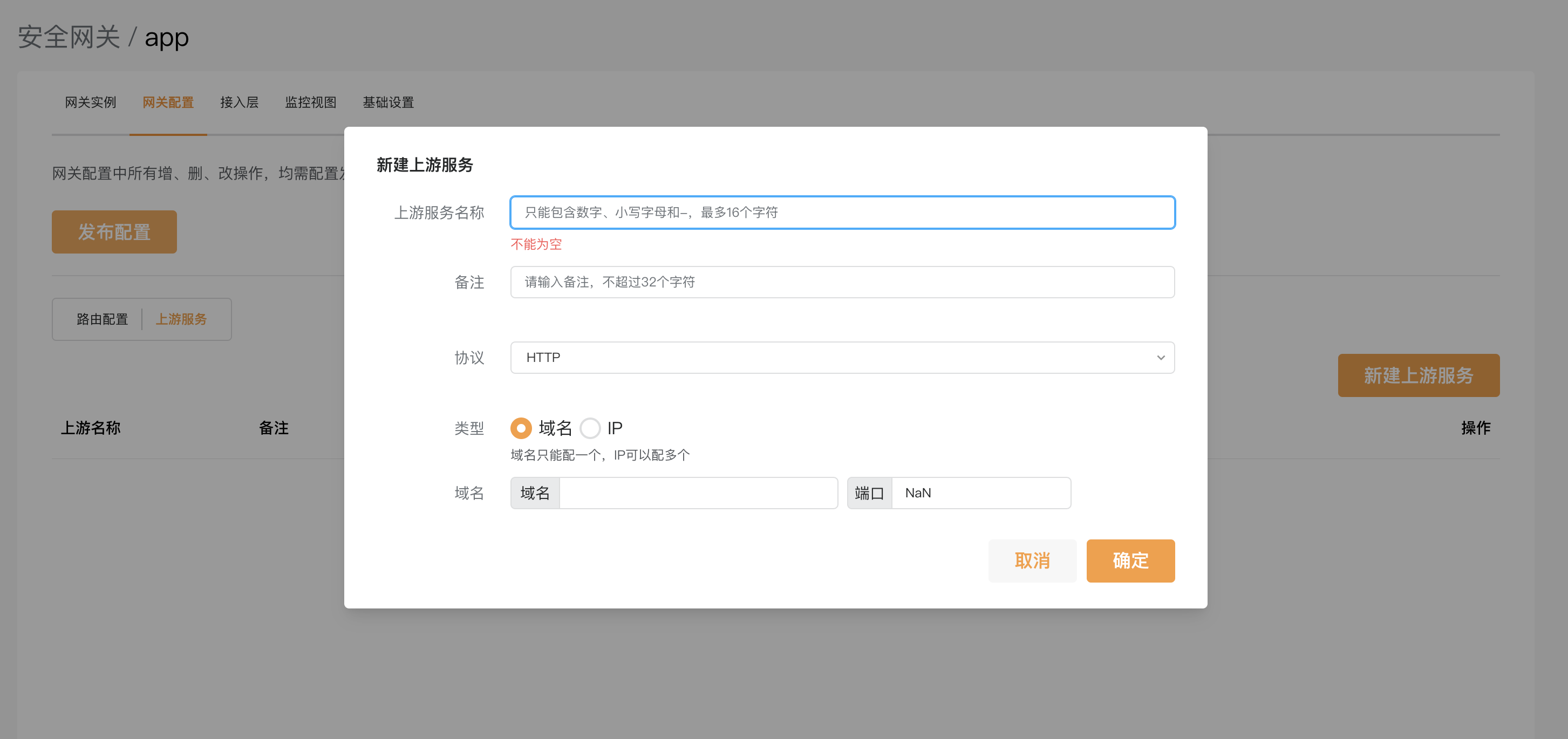 在配置页点击「新建上游服务」按钮,弹出对话框,我们来填写一下。