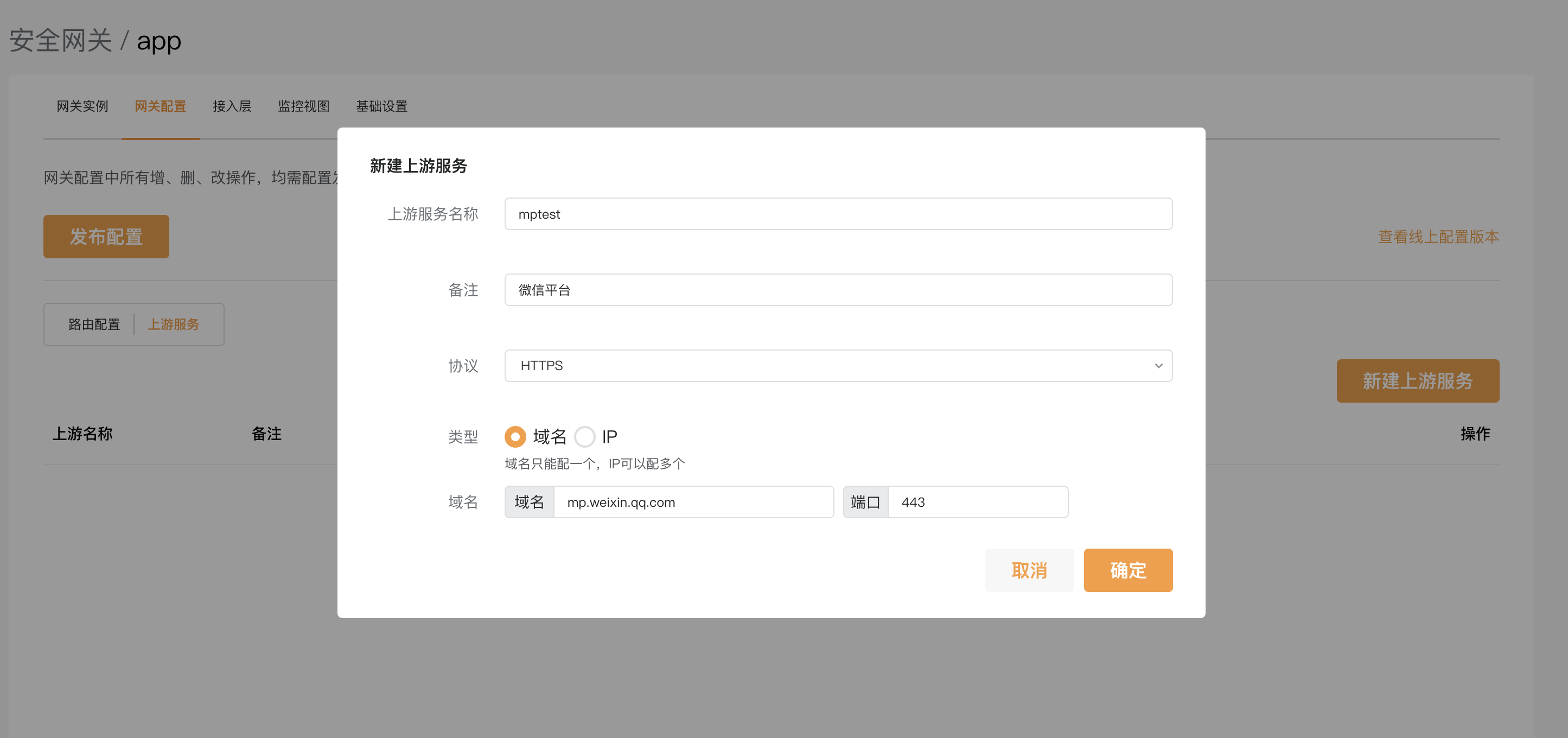 - 域名:填写域名,可以在公网指向网关实例所在的服务器,端口填写网关实例对外暴露的服务端口。