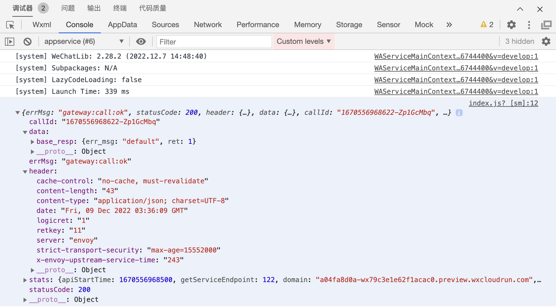 保存文件后,触发重新编译,在调试器console中可以看到网关请求打印的返回数据: