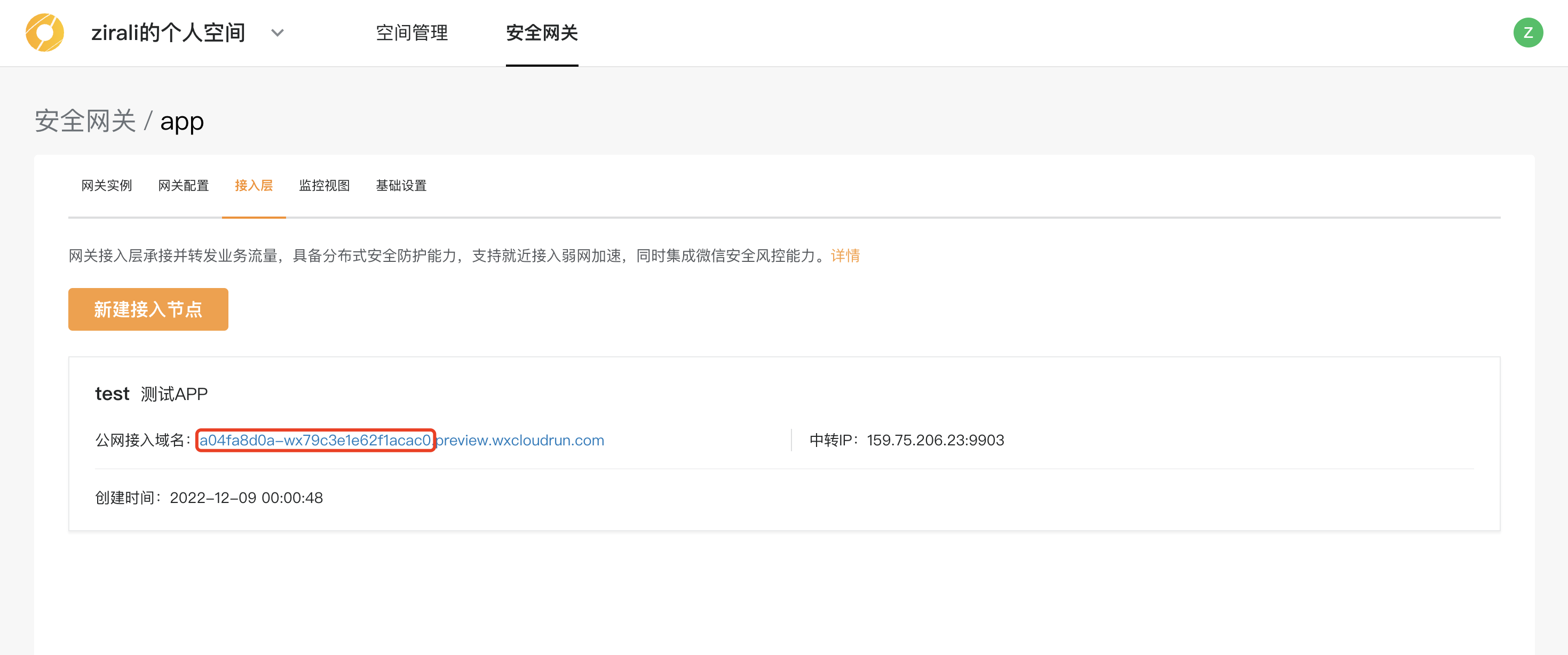 在安全网关控制台,转到「接入层」页面,将接入节点的默认域名取出,截取ID部分,如下图所示: