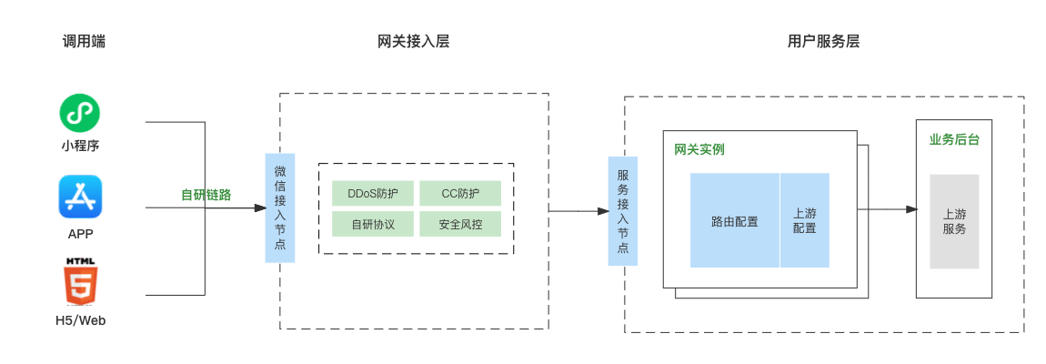 接入层是在微信侧的概念。网关接入层承接并转发业务流量,具备分布式安全防护能力,支持就近接入弱网加速,同时集成微信安全风控能力。