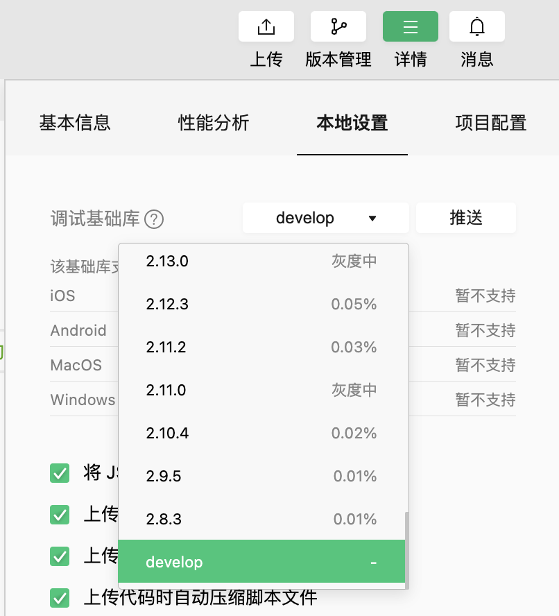 导入后,右上角点击「详情」按钮,在本地设置中,基础库选择develop