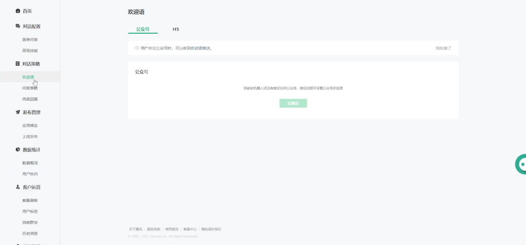 其中,「对话策略」模块整合了欢迎语、问答策略与兜底回复三项全局对话配置,覆盖了完整的智能对话流程。