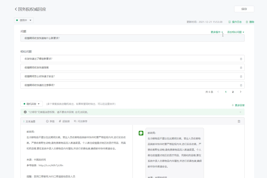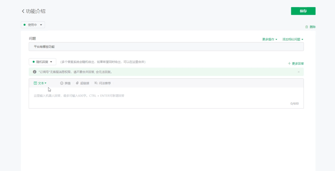 在新版本中,简单问答将独立于高级技能,不再沿用高级技能中相对晦涩的术语与规则,而是改用更直观的词汇、更简洁的UI。在新版本中,即使您是第一次接触对话机器人的新手,也能零门槛丝滑上手。
