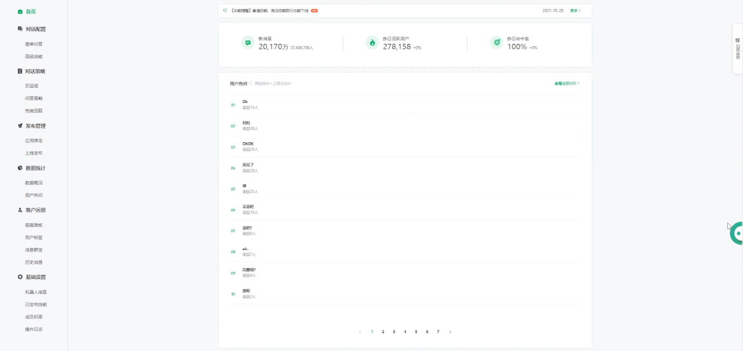 对话平台V2.0对侧边导航进行了架构优化,导航共分为「对话配置」「对话策略」「发布管理」「数据统计」「客户运营」「基础设置」六级模块,使平台功能分类更细致、使用路径更清晰。