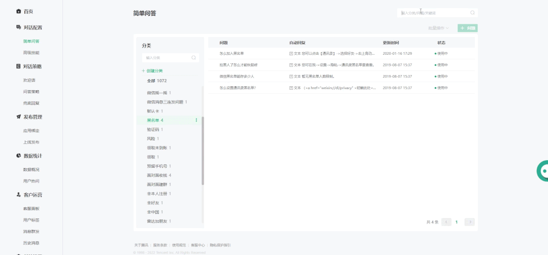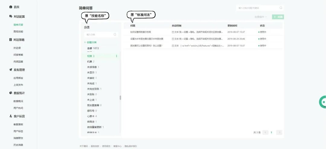 我们将“普通技能”更名为“简单问答”,更加关注其“一问一答”的本质。旧版中的“普通技能”、“标准问法”、“意图”等术语,在新版中被替换为“分类”、“问题”等更加易于理解的词汇,帮助新手更轻松地入门。