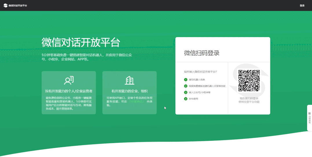 在新版门户中,我们将扫码入口外置,注册登录更加便捷。通过页面内置的场景示例,您能够即刻体验由对话平台配置的微信官方客服机器人,快速感知平台所具备的对话能力。