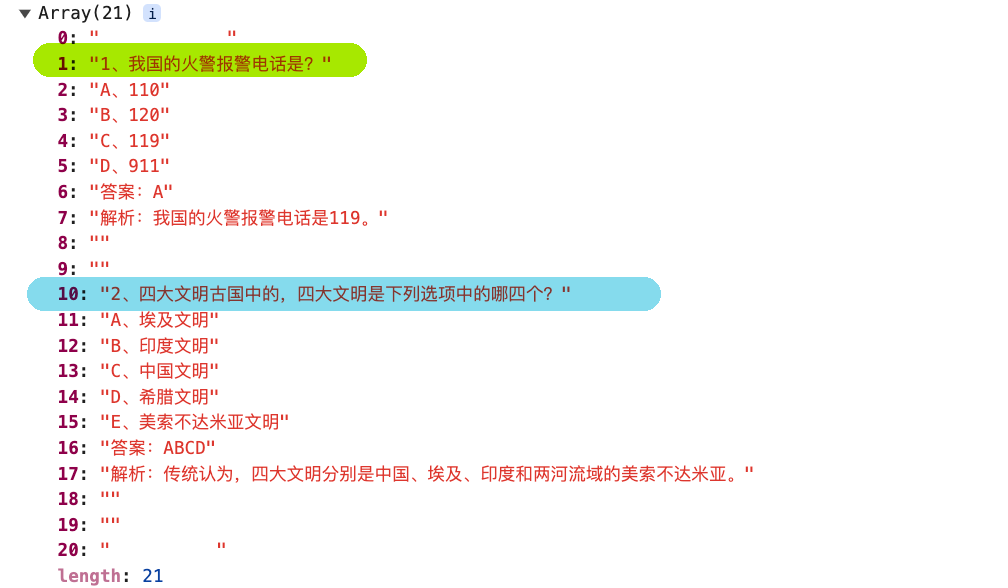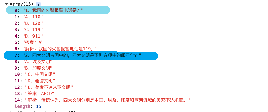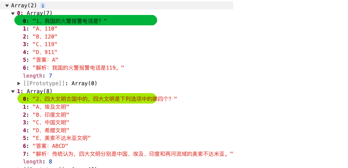 在当前场景,将上述数组呢,进一步提取出两个数组中,如下所示,此时数组是一个二维数组,每个数组是一个完整的题目信息