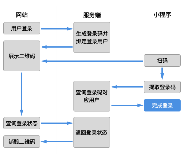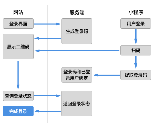 用户在小程序中使用扫码api扫码后从扫码结果中提取出登录码,提交到后端接口,后端接口将登录码和当前登录小程序的用户绑定。网页端在展示二维码后,开启一个轮询,定时访问后端接口查询该登录码的登录状态,在该登录码和小程序已登录用户绑定后完成网站上的用户登录。