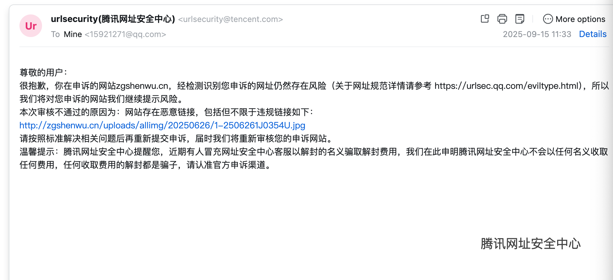 https://zgshenwu.cn/,申诉后把问题链接删除后依然不能连接,