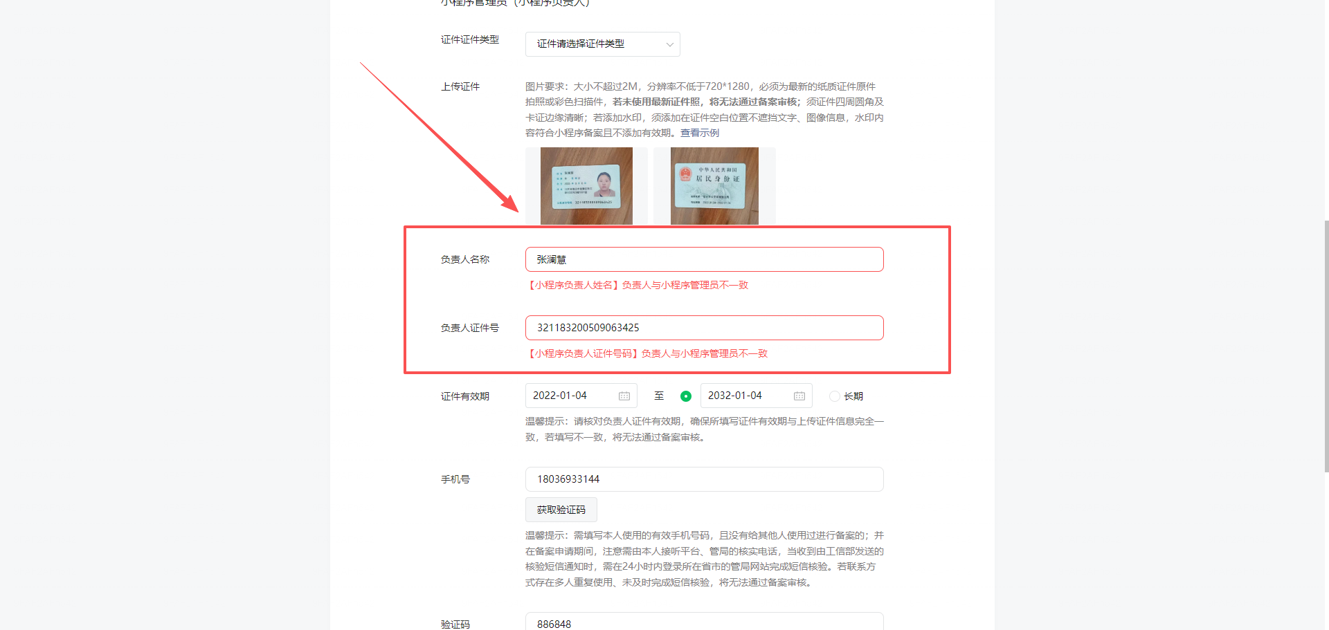 换绑了负责人的身份信息当做小程序管理员,会什么会提示不一致,请专人与我联系!