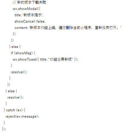 showCancel: false});});},【checkVersion】/** 小程序自动更新 */export const checkVersion = (showMsg = false) => {return new Promise((resolve: any, reject: any) => {try {const accountInfo: any = wx.getAccountInfoSync();if (accountInfo.miniProgram.envVersion != "release") {if (showMsg) {wx.showModal({title: '更新失败',showCancel: false,content: '此版本不支持更新:' + accountInfo.miniProgram.envVersion,success: function () {resolve();}})} else {resolve();}return;}// 小程序自动更新if (wx.canIUse('getUpdateManager')) {const updateManager = wx.getUpdateManager();updateManager.onCheckForUpdate(function (res) {// 请求完新版本信息的回调