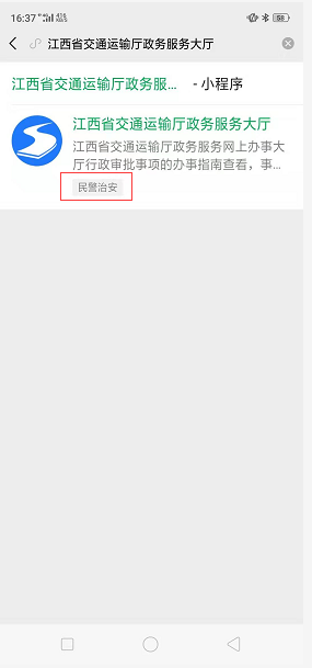 但是从微信中搜索出小程序后,显示的类目为:民警治安,显示的类目跟注册时的类目不一致,错误,如下图