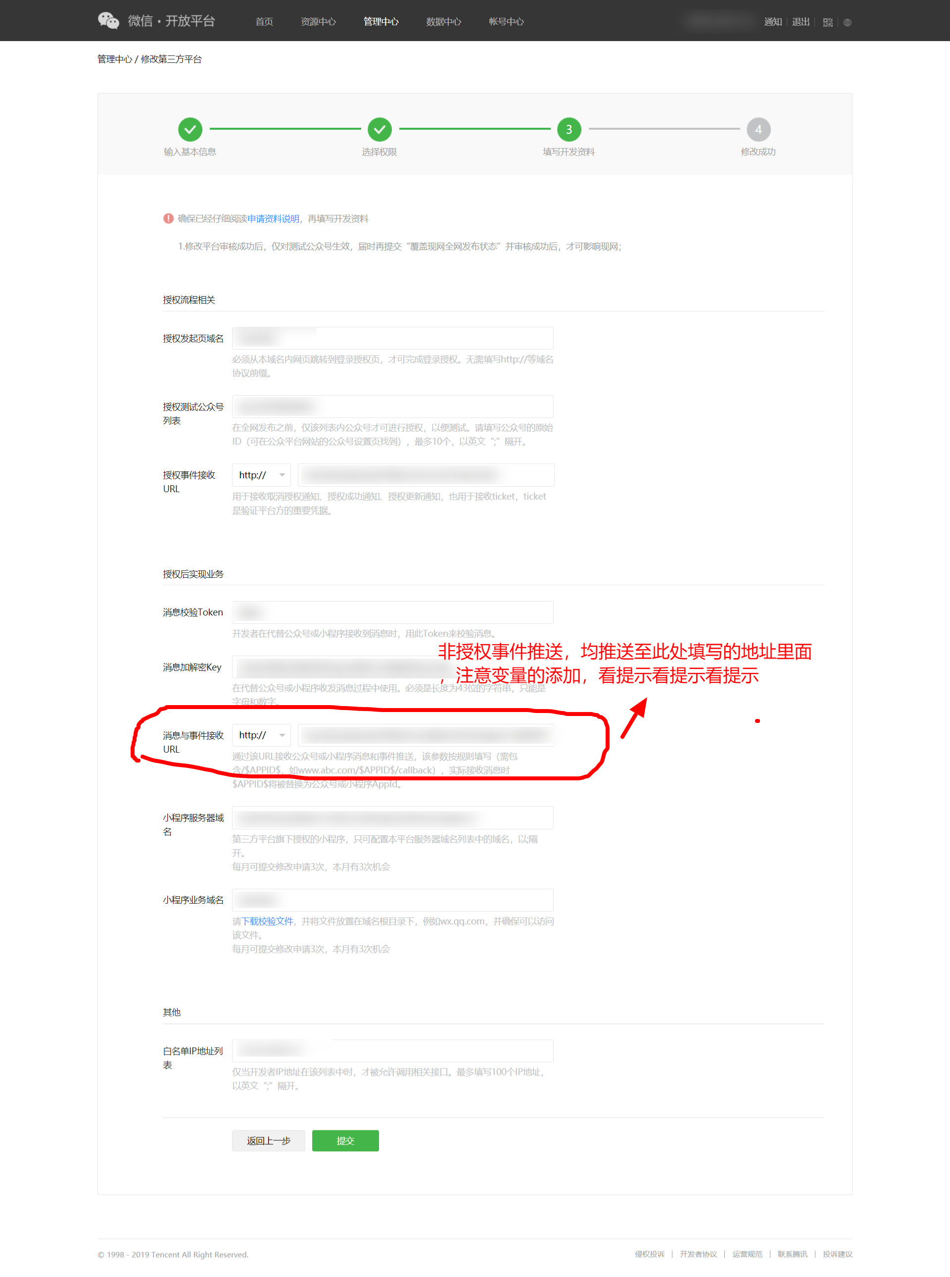 另外,第三方平台代创建的小程序,没有mp.weixin.qq.com这个平台下面的账号(即没有官方的小程序后台,无法配置消息转发地址),所以第三方平台功能里面给出了事件消息接收的能力,填写如下URL之后,代创建的小程序事件、消息(包括客服消息),均会转发至填写的URL地址。