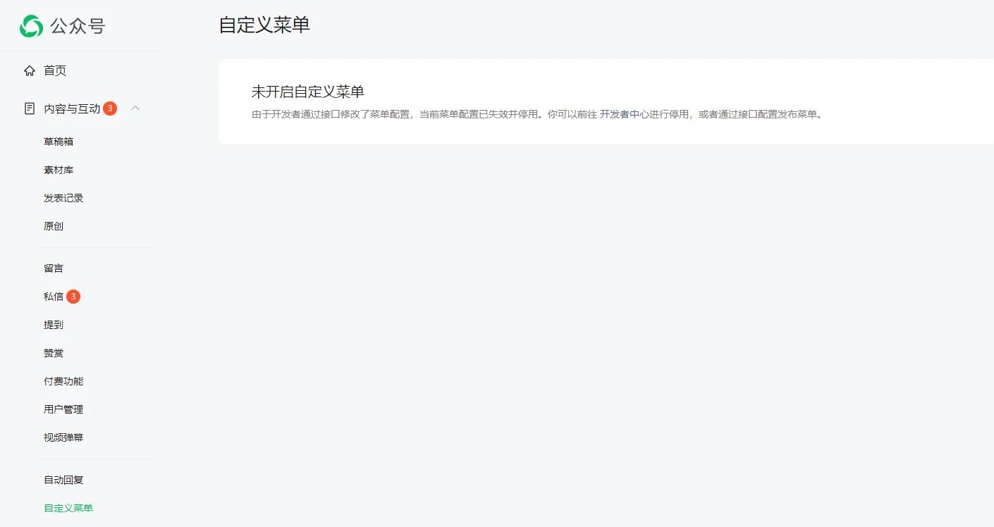 我想重新修改自定义菜单,但进入后显示未开启自定义菜单如图1,跳转到开发者中心后是图2界面,想恢复到正常的操作界面该如何操作呢?