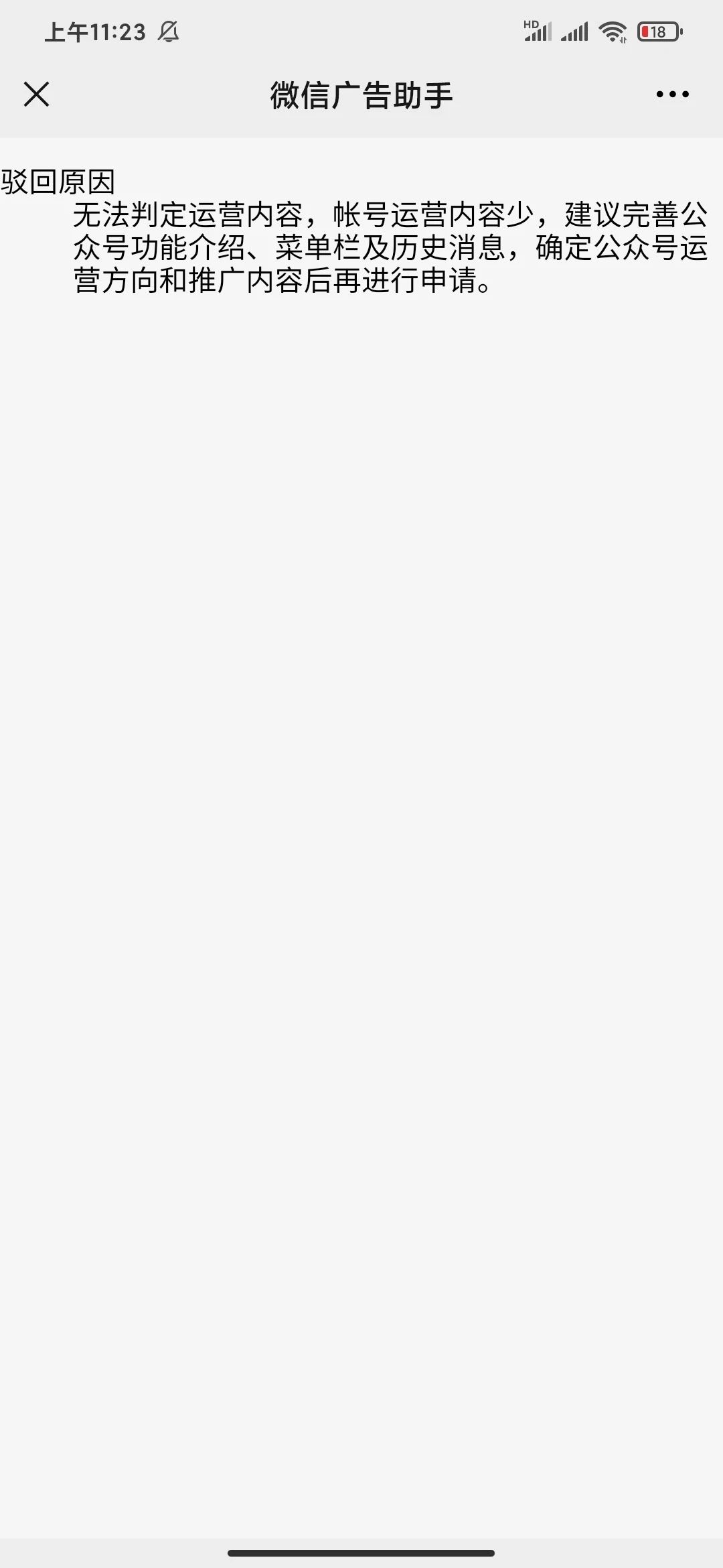 驳回理由为:无法判定运营内容,账号运营内容少,建议完善公众号功能介绍、菜单栏及历史消息,确定公众号运营方向和推广内容后再进行申请。