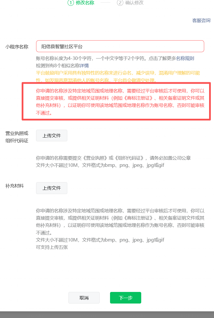 需要使用阳信县智慧社区平台作为小程序名称,应该哪个部门提供什么材料
