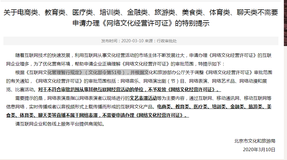 小程序开发,教育类视频直播,需要资质5选1,其中的《网络文化经营许可》,审批部门北京文化旅游局3月10号下发了文件,教育类无需再申请,是否已经无需申请即可开通直播?