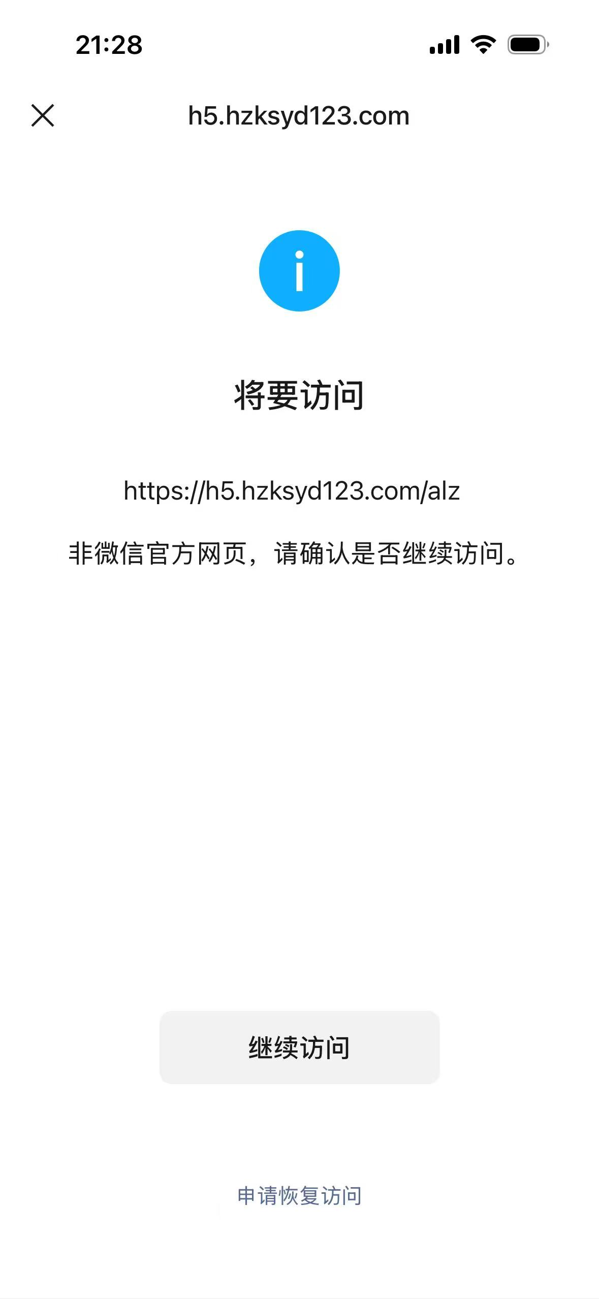 您好,域名(https://h5.hzksyd123.com/alz/)域名在腾讯云注册并备案通过,申请恢复也没用。服务器也在腾讯云,浏览器访问正常,我是网站开发者,访问时间如图微信访问网站出现“非微信官方网页,请确认是否继续访问”,经检查网页里没有不安全的内容,请核实后帮忙解除拦截,谢谢!网站内容不存在诱导分享的内容,请核查!