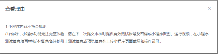 小程序审核一直不通过,说是功能无法完整体验,但里面的功能都是可以打开体验的,是什么原因?