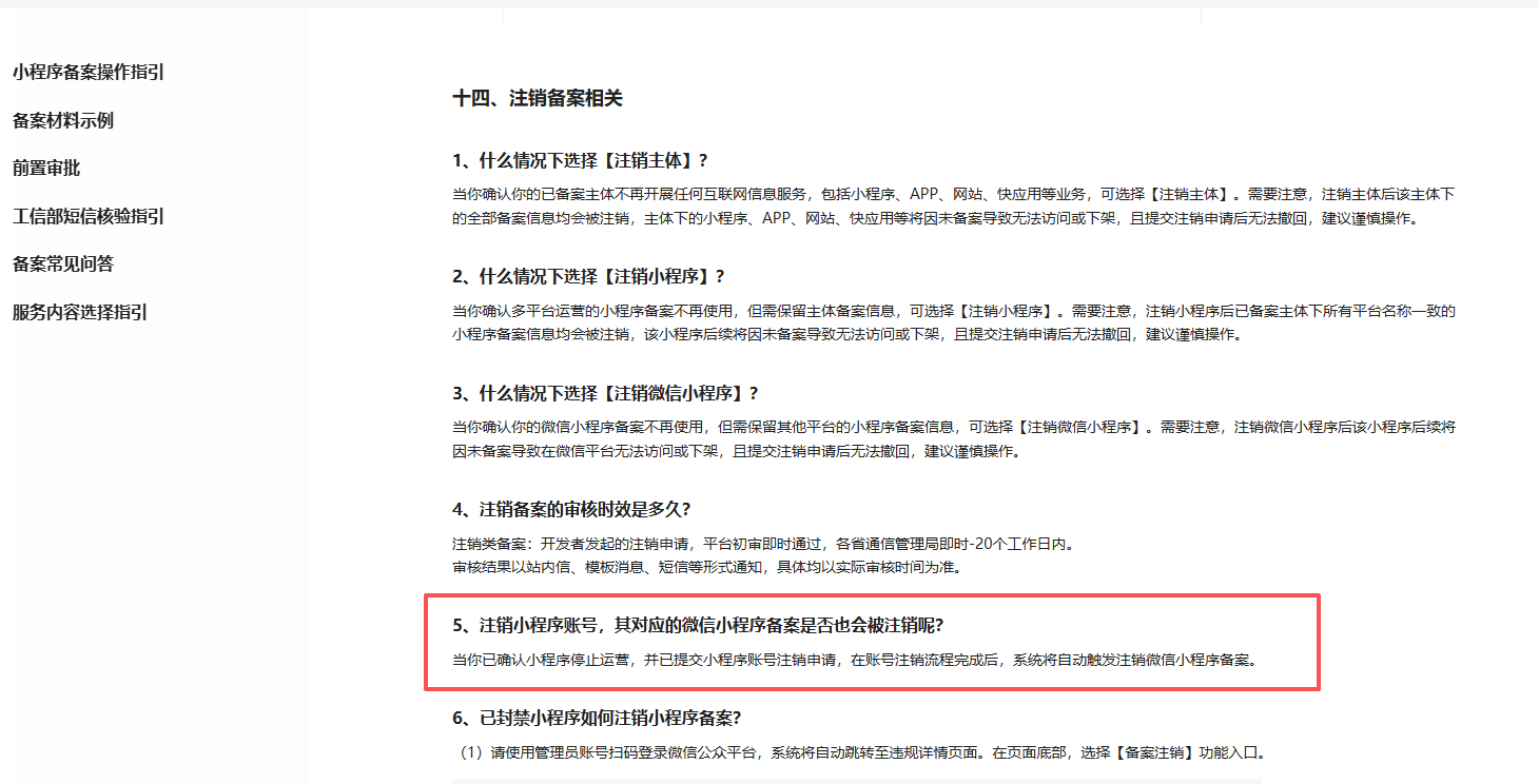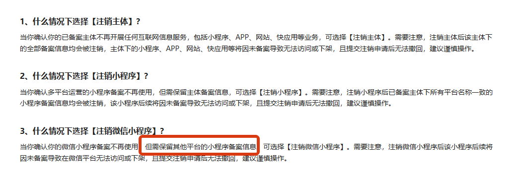 因注销是不可逆转的操作,建议开发者自行确认注销需求,避免造成不必要的损失,注销区别请参考:https://developers.weixin.qq.com/miniprogram/product/record/record_faq.html#%E5%8D%81%E5%9B%9B%E3%80%81%E6%B3%A8%E9%94%80%E5%A4%87%E6%A1%88%E7%9B%B8%E5%85%B3