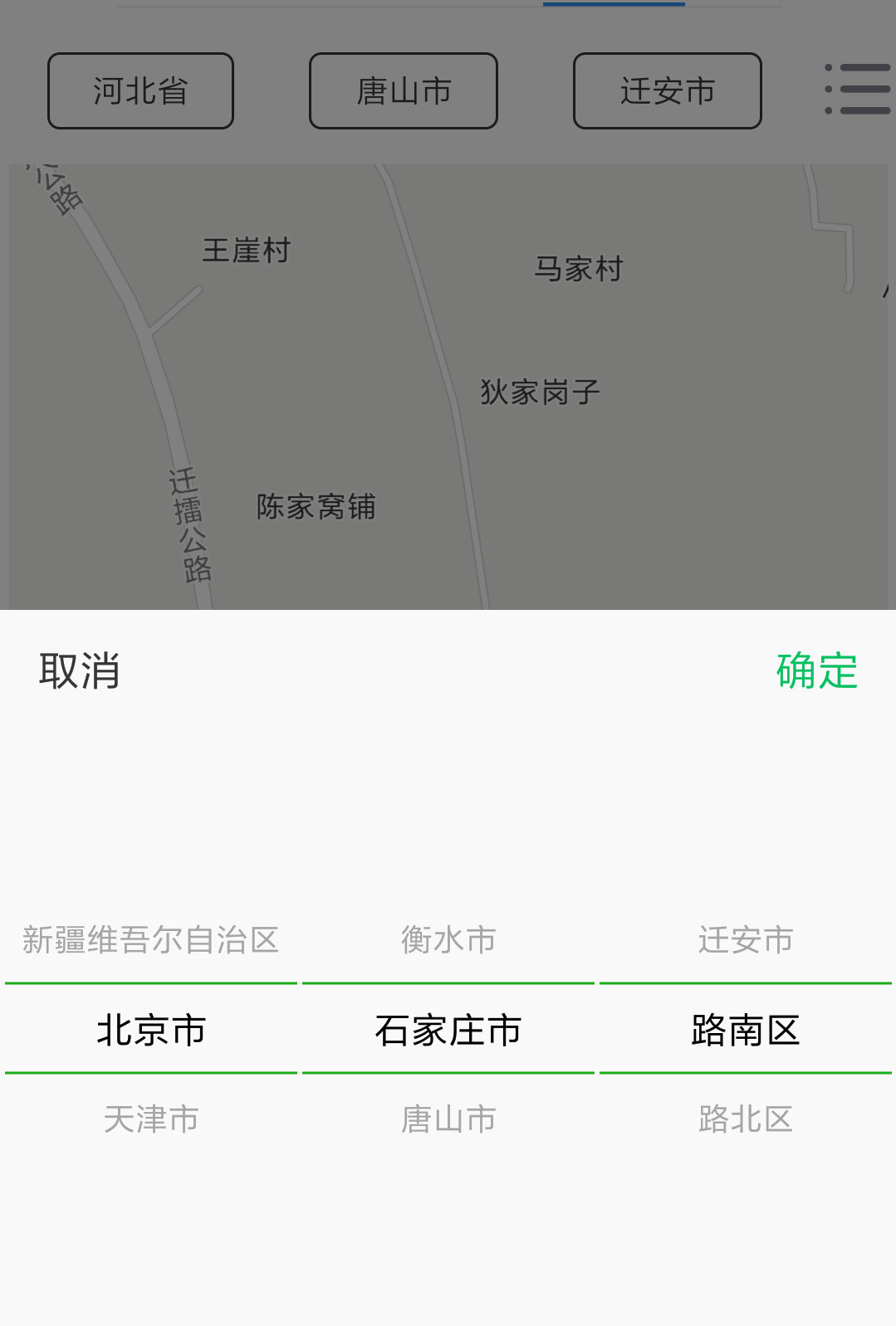 第一次选择的时候弹出面板默认值:应该是河北省,唐山市,迁安市,但是最终的结果就可能不是。