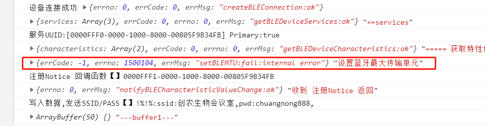 有些手机可以设置成功,但是有部分手机,设置失败,报错信息为: errCode: -1, errno: 1500104, errMsg: "setBLEMTU:fail:internal error