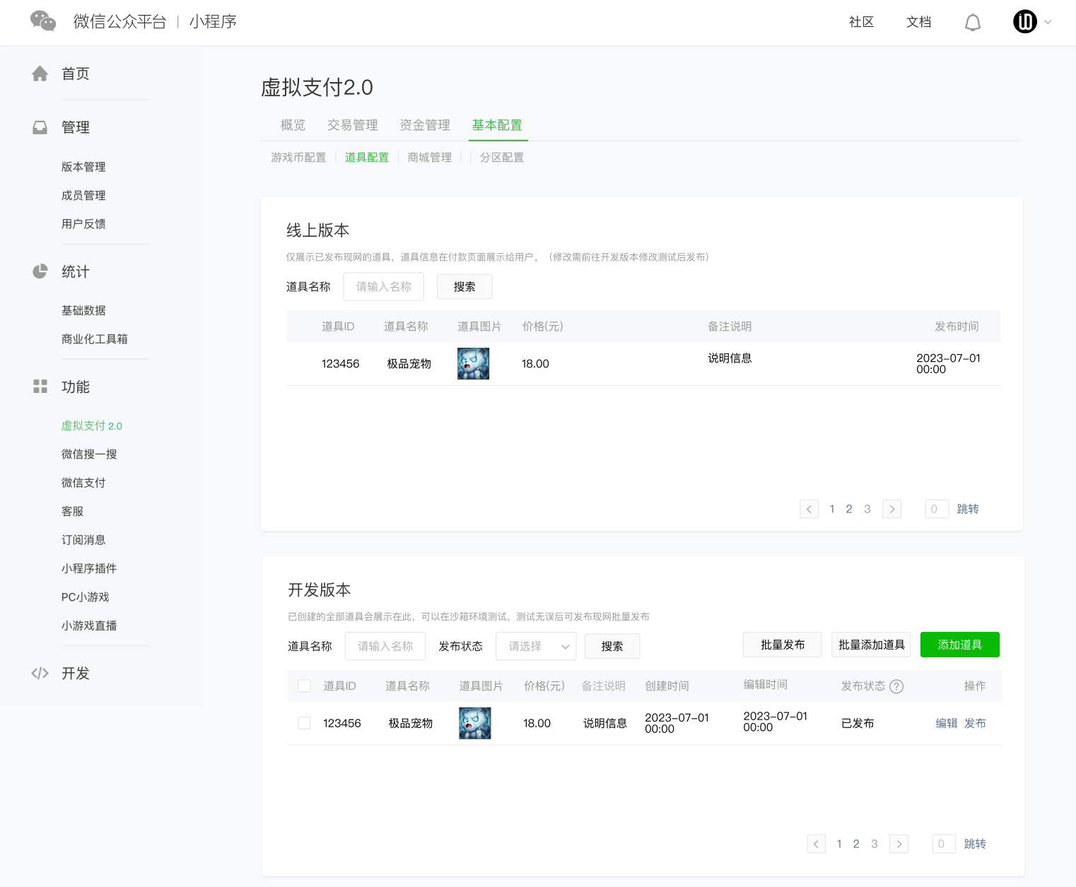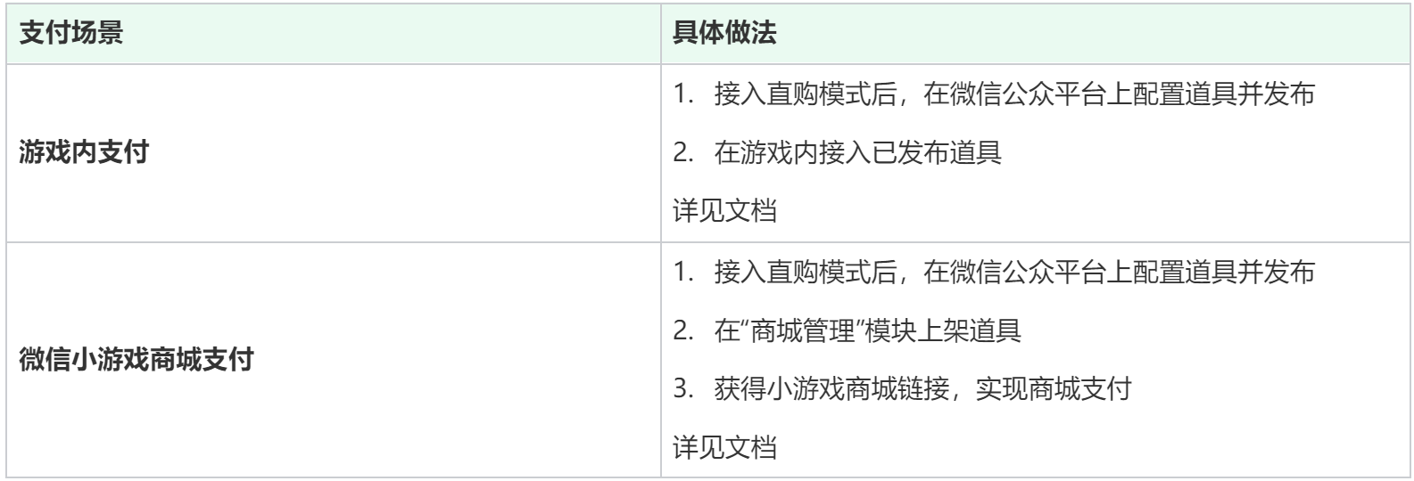 开发者可通过在微信公众平台(mp.weixin.qq.com)-虚拟支付2.0-基本配置-道具配置中创建、测试、发布道具,实现游戏内的道具直购模式。