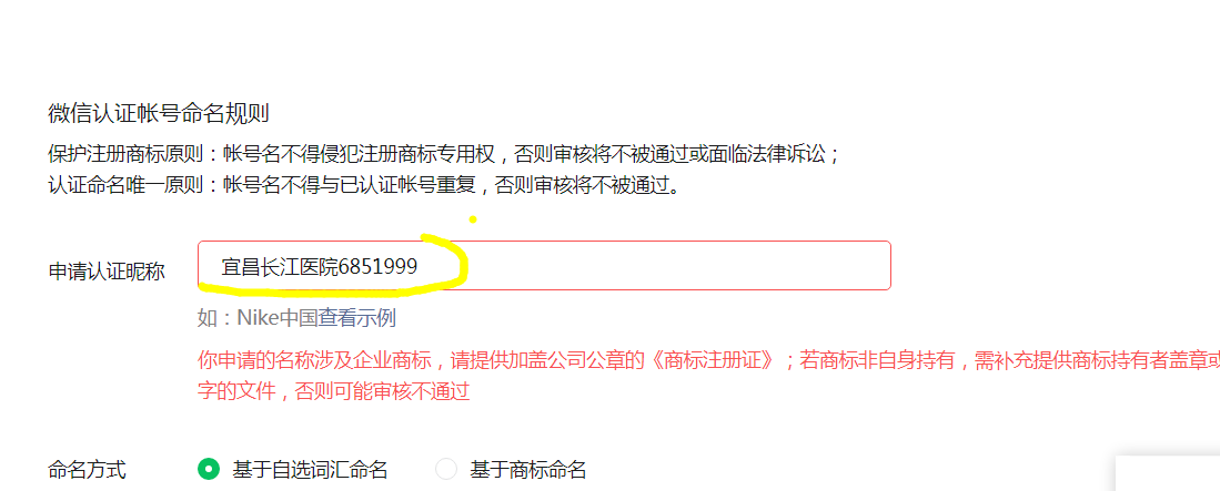 你好,申请昵称提示涉及企业商标,请选择“基于商标命名”方式提交并补充上传相关商标资料或相关命名佐证,证明有权合理使用该账号名称;提交后审核公司会根据提交的材料进行审核,审核结果需以审核人员告知结果为准。