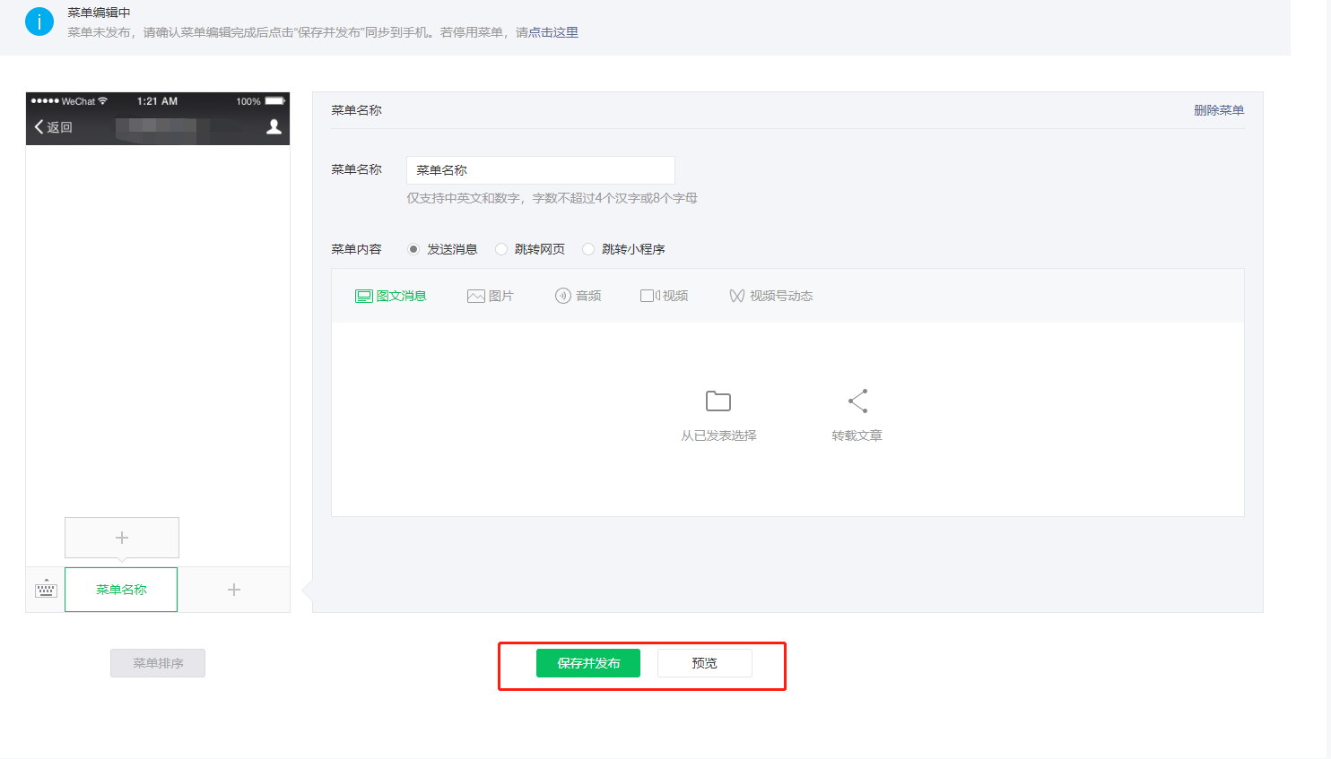 菜单自定义后,怎么保存并发布,没有提示发布成功