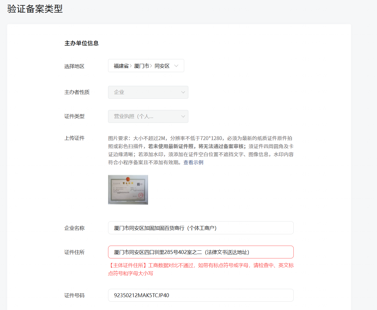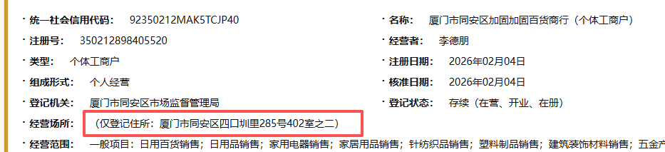 试试这个:(仅登记住所:厦门市同安区四口圳里285号402室之二)