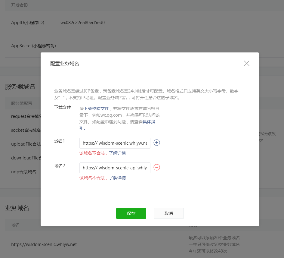 我也是这个问题,服务器域名也设置了,校验文件也放好了,就是一直提示业务域名不合法