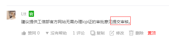 建议提供工信部官方网站无需办理icp证的审批意见提交审核。