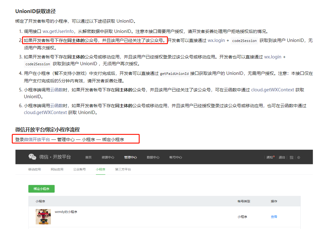 这个图上面获取途径,我使用的是第二种,但是现在即使用户关注了公众号,code2Session还是无法获取UnionID。但是我看到下面绑定流程却是是在开放平台里面,而我的公众号与开放平台并没有做绑定,但是各子都绑定了小程序。我想问的是小程序到底属于公众号的,还是开放平台的?我是否需要把公众号与开放平台进行绑定呢?