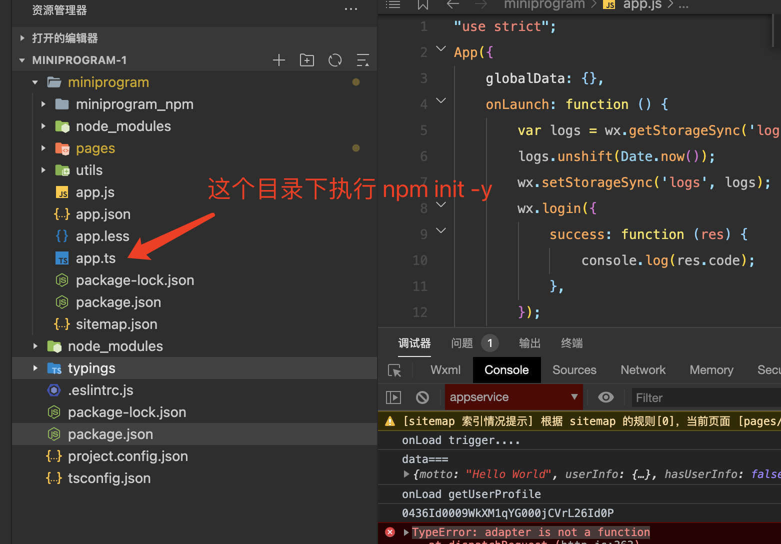 1. 在小程序根目录(**** app.js所在目录 ****),打开cmd命令窗口,输入: npm init -y