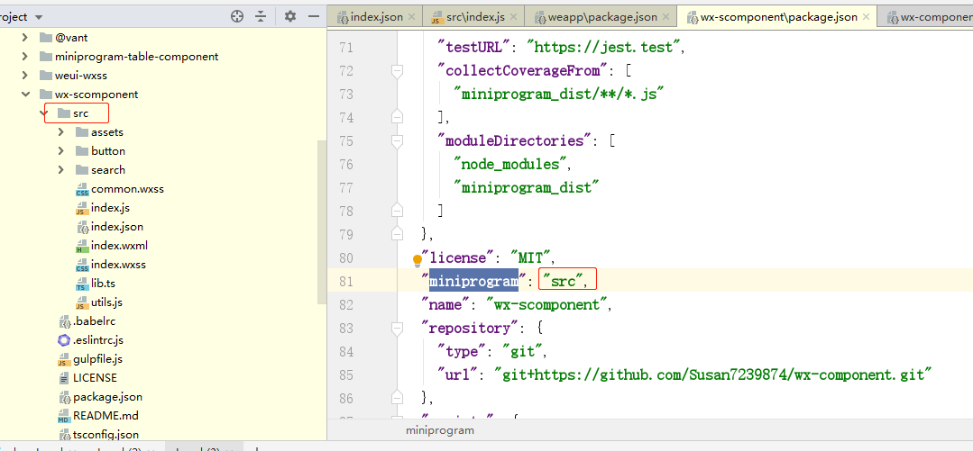 wx-scomponent是一个我install后在node_modules下的npm包,对其package.json设置,删除本身的main字段,修改miniprogram为我组件存放的src目录