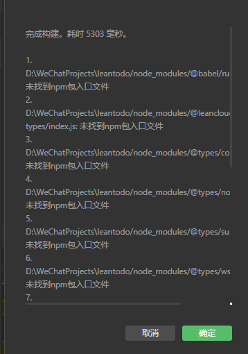 完成构建。耗时 1848 毫秒。1. C:\Users\LIFETIME\WeChatProjects\ticket\node_modules\@types\node\index.js: 未找到npm包入口文件2. C:\Users\LIFETIME\WeChatProjects\ticket\node_modules\weui-wxss\dist\app.wxss.js: 未找到npm包入口文件
