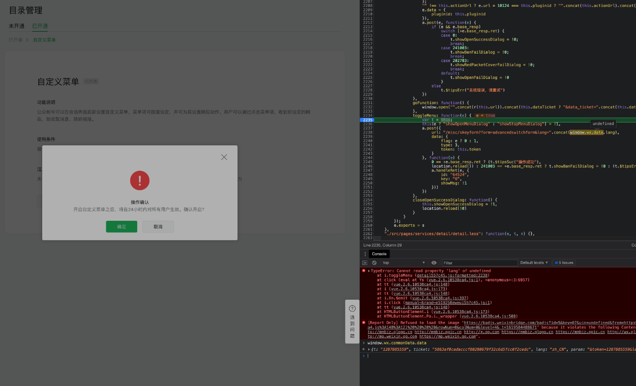 开启自定义菜单报错