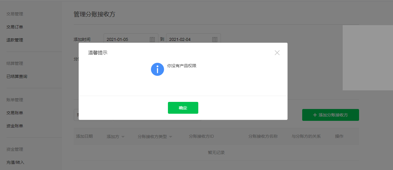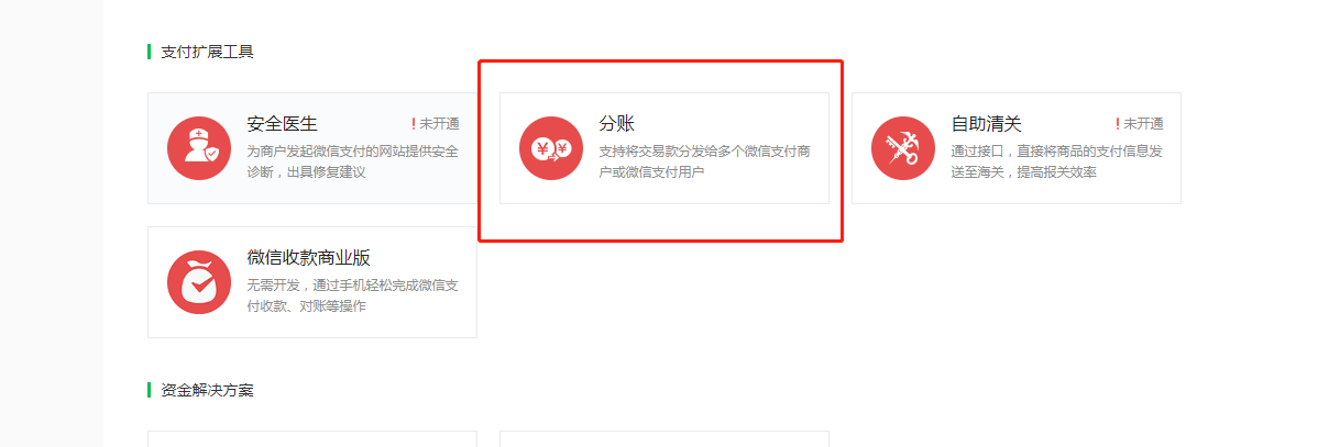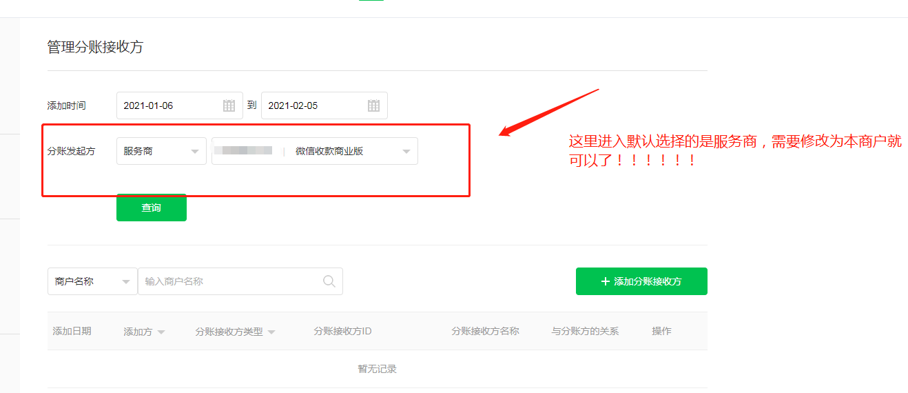 你开通了微信收款商业版,这里会多一个服务商选择,如果需要微信收款商业版服务商下分账权限,需要申请,把分账发起方改为本商户即可。