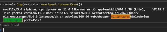 // 真机测试 var ua = navigator.userAgent.toLowerCase(); ua.match(/wxwork/i) == ‘wxwork’ // 结果为true或者false /wxwork/i.test(navigator.userAgent); // 结果为true或者false